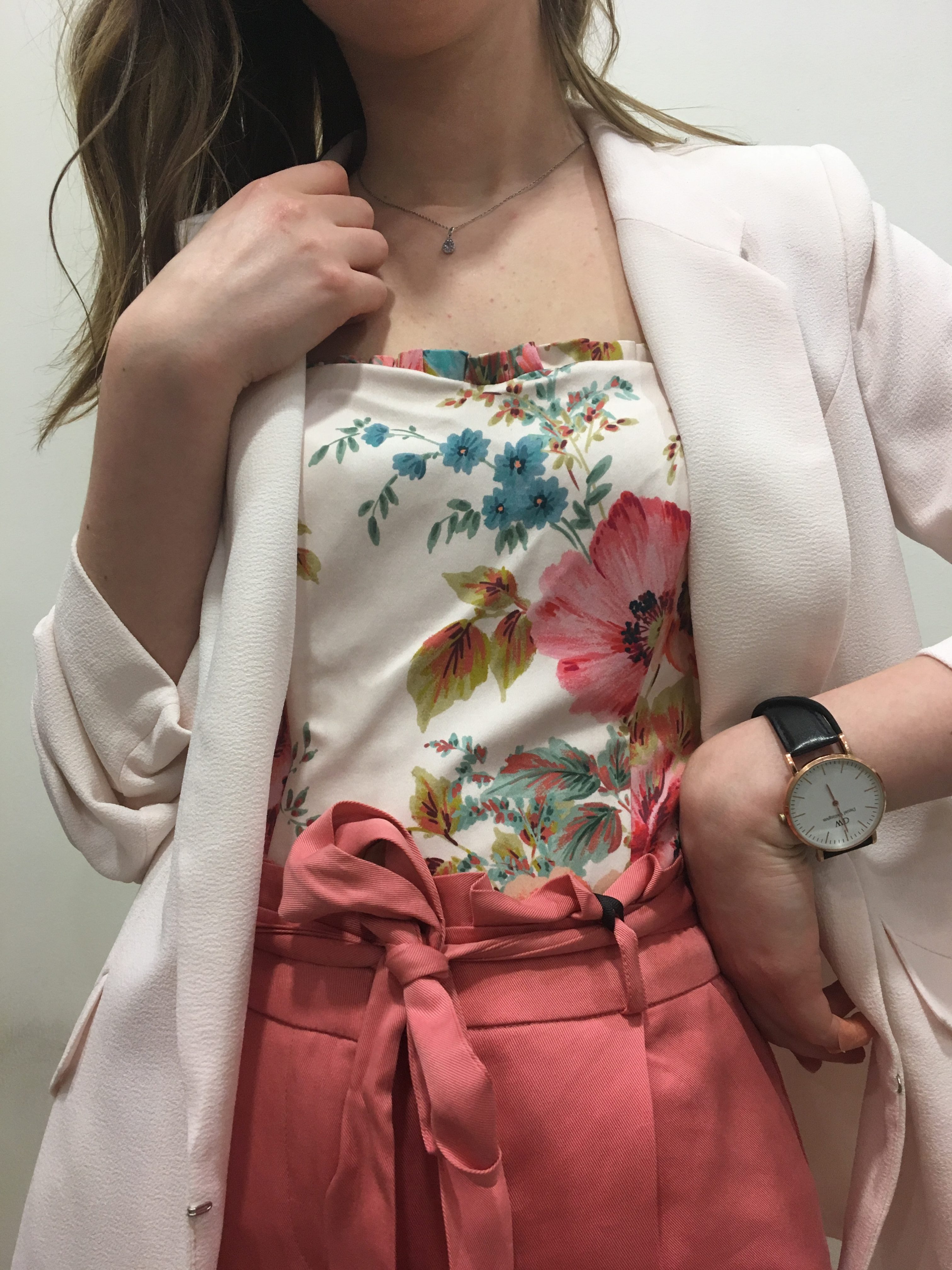 Le bustier fleuri est une merveille porté avec ce joli pantalon paperbag couleur pêche. Les pantalons paperbag sont tout simplement parfait lorsque le soleil pointe le bout de son nez. Sa coupe droite taille haute vient structurer la silhouette et la jambe plus particulièrement. Le tissu, lui, apporte de la fluidité et de la souplesse au mouvement. J’aime beaucoup cette ceinture de tissu qui vient marquer la taille et finir le pantalon avec élégance.