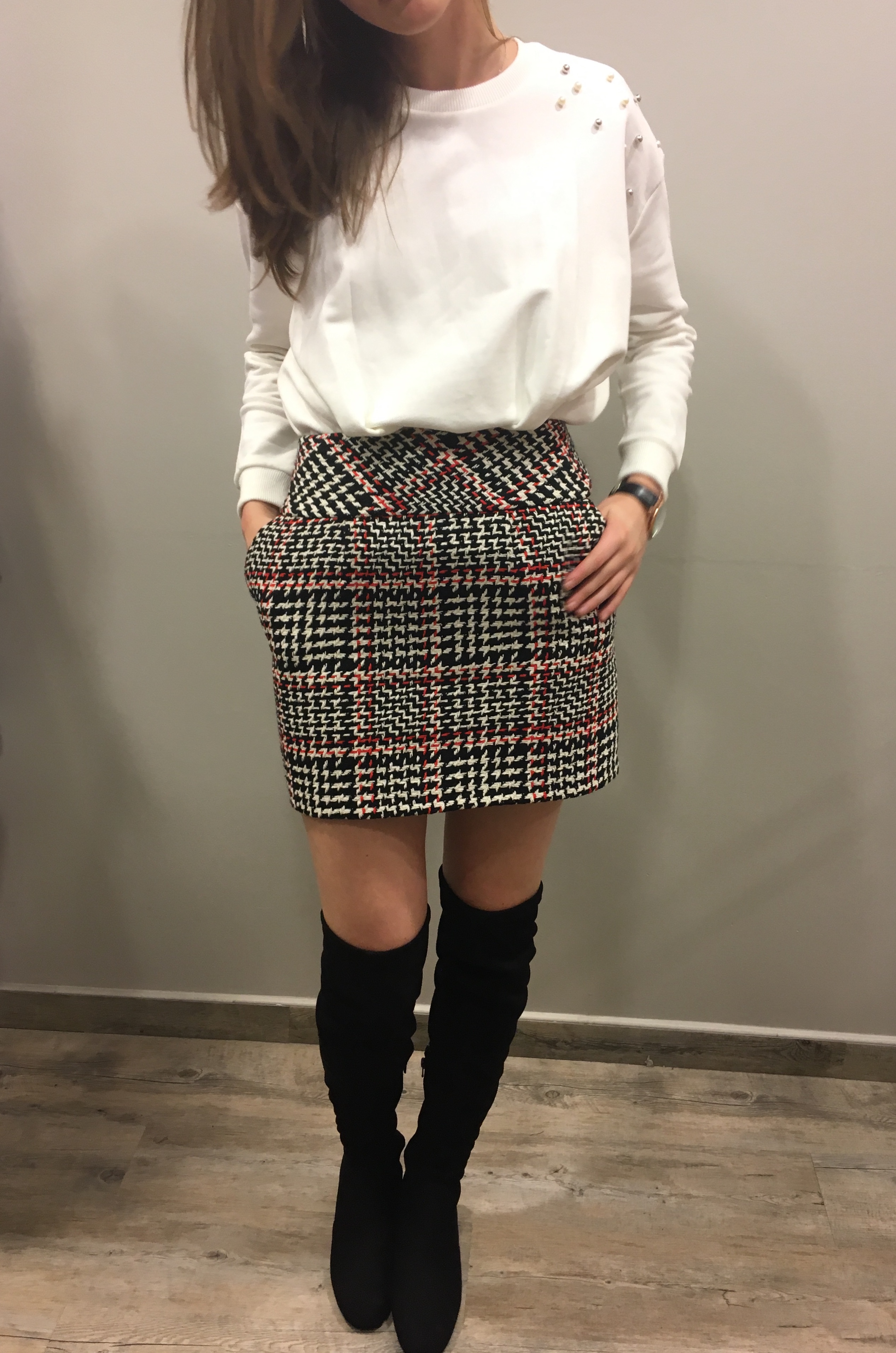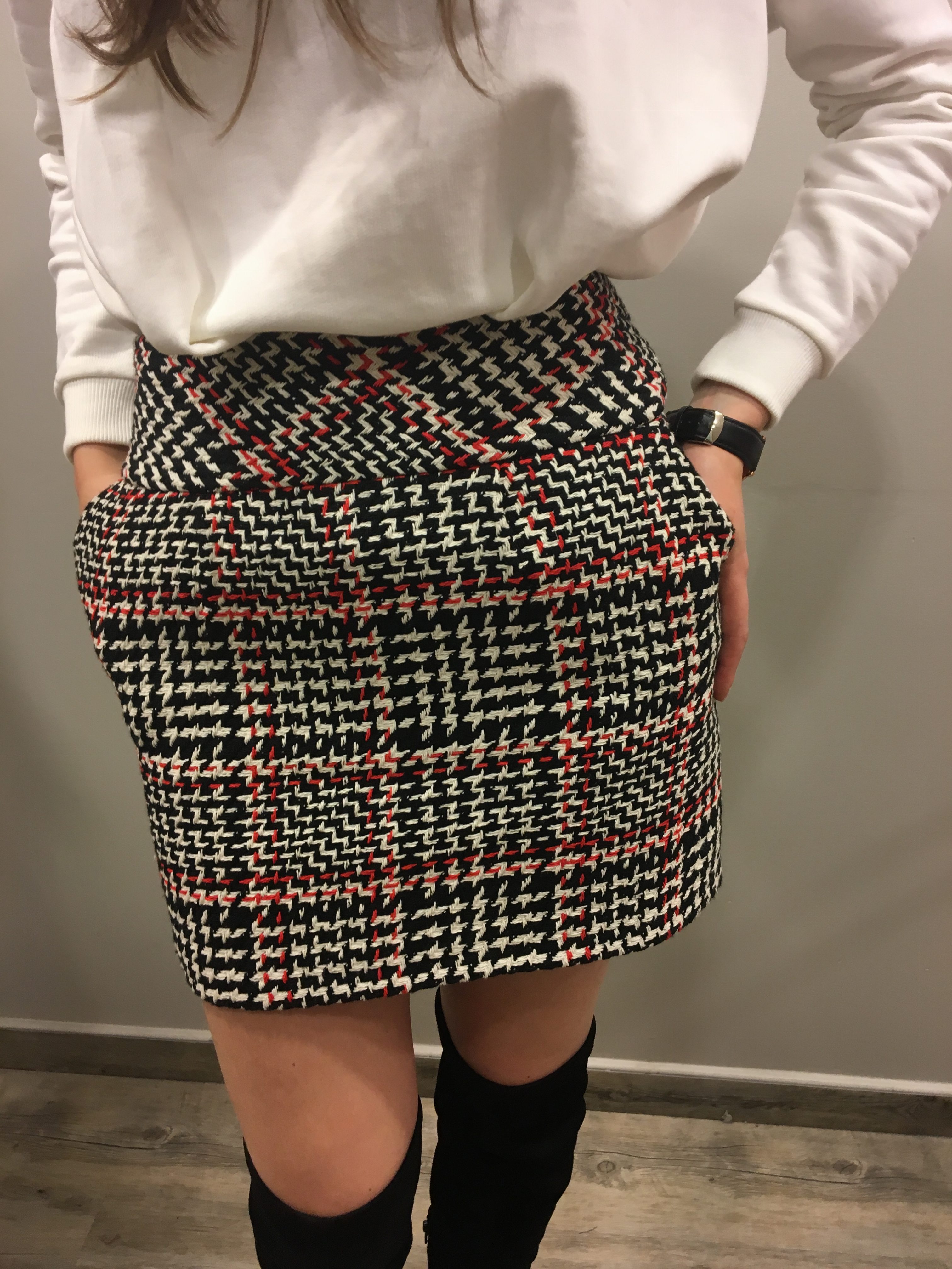 Dans la catégorie « À peine arrivé en magasin, déjà dans mon dressing » je demande cette jupe à carreaux multicolores en coton ! Je dis merci la soirée VIP NAF NAF. Je n’ai pas pu résister au côté un peu vintage de la jupe NAF NAF. Elle marque très légèrement la taille et vient épouser la forme des hanches pour ensuite repartir en parallèle le long des jambes. De plus, deux poches sont présentent aux extrémités de la jupe et suivent la silhouette de cette dernière.