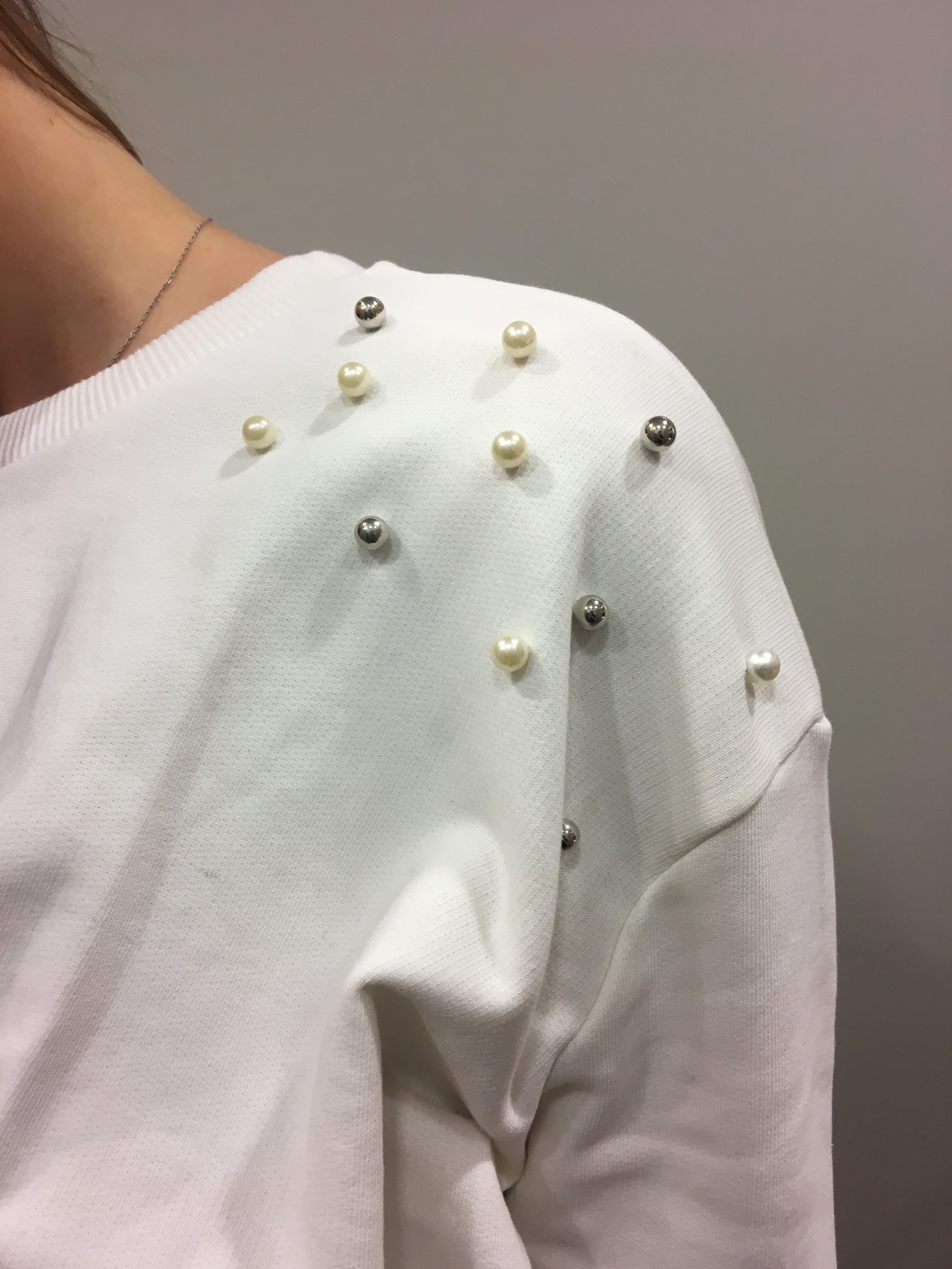 J’avais envie de casser le classique de la jupe en y apportant une pièce contraste : le sweat. C’est une pièce assez brute mais ici on l’arbore avec une pincée de féminité avec le détail tendance du moment : les perles. On les retrouve au niveau des épaules en blanc et en argent. Je suis mitigée à propos de ce drapé qui se joint en bas du sweat. Ça apporte trop de volume vers l’avant à mon goût. En revanche, je le trouve très pratique quand il s’agit de le rentrer à l’intérieur de la jupe.