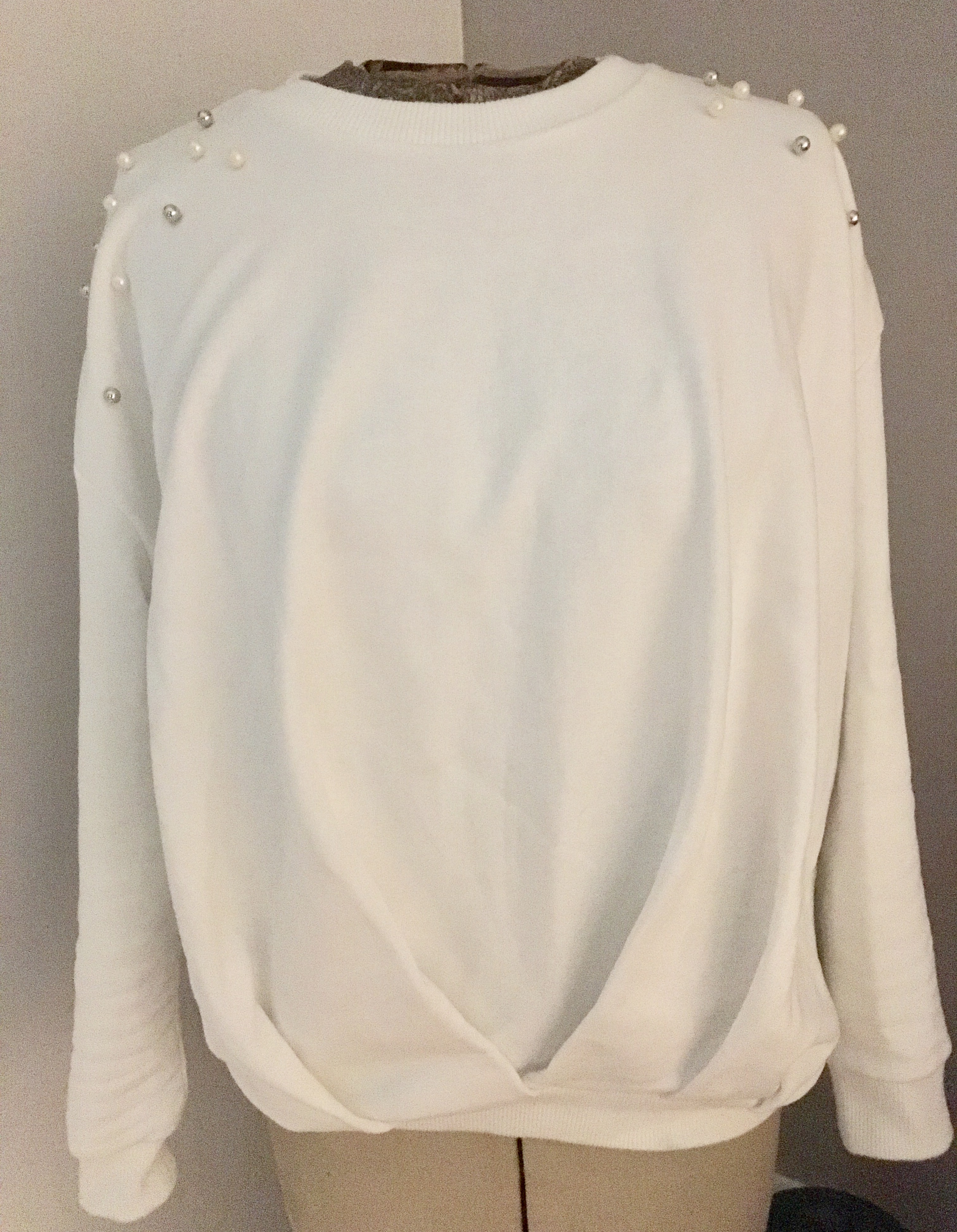 […] Après le sweat, c’est le top aux manches bouffantes. Et quand les perles ne sont pas sur les épaules, elles sont sur les manches. La couture en haut au centre du top sépare le tissu en un pli qui retombe sur la poitrine. J’ai craqué autant pour l’esthétisme de ce top que pour son confort. La matière est très agréable. […]