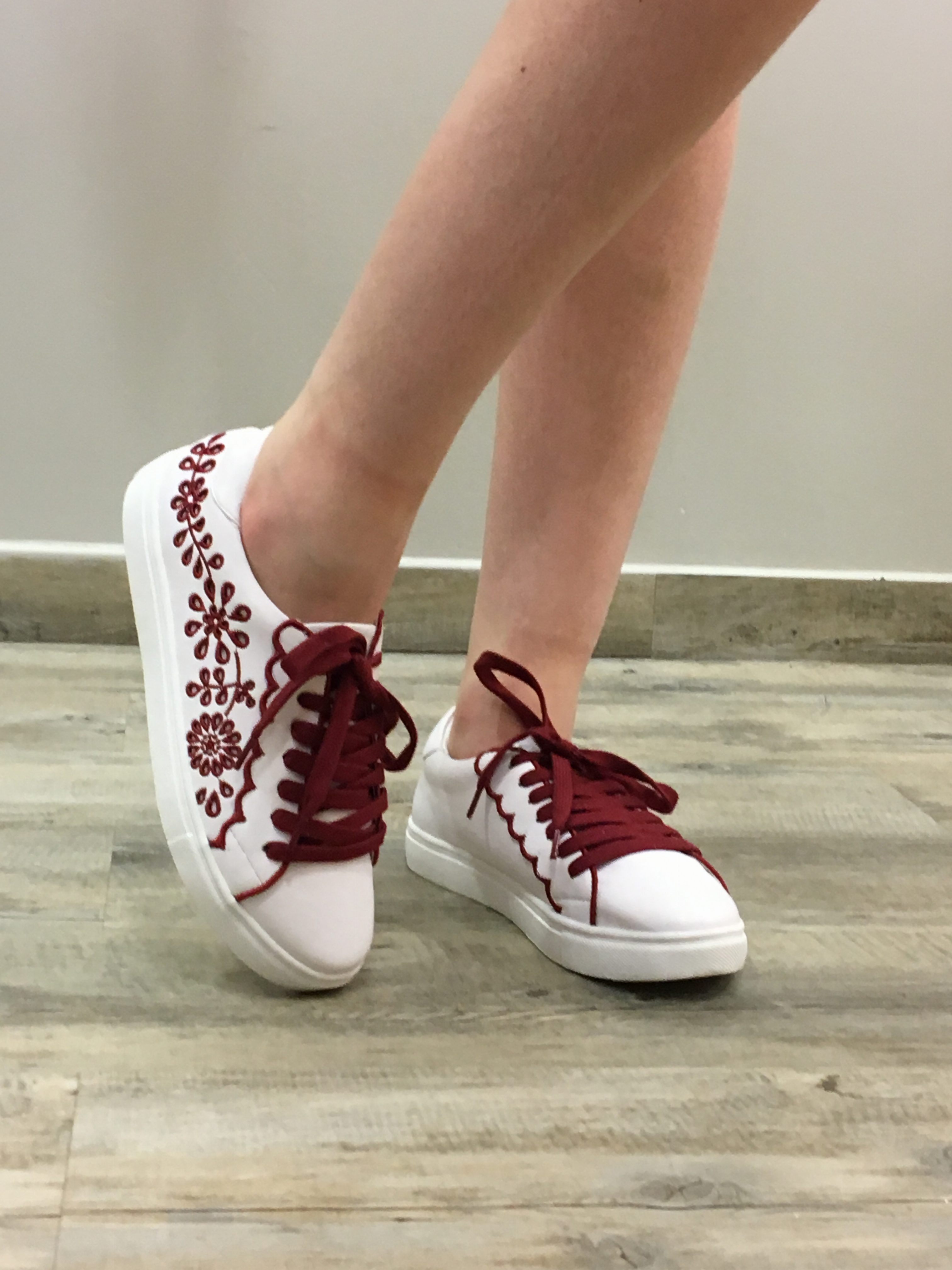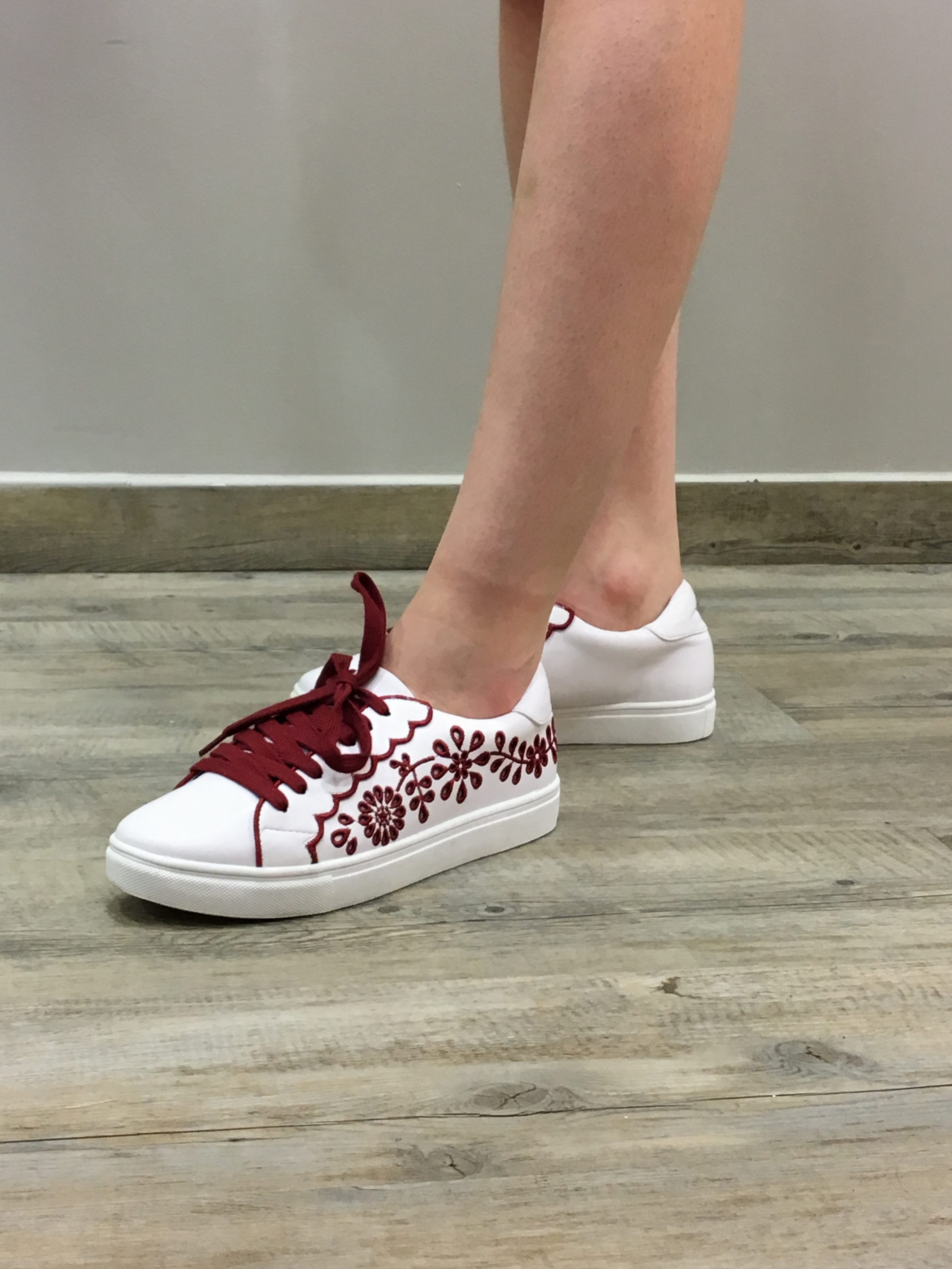 Et oui, j’ai complété le look avec ces petites baskets blanches aux broderies florales rouges. Elles sont super confortables, comme celles à paillettes ! Et puis, elles sont très jolies avec une pointe d’originalité. Ça change de ce que l’on peut voir dans les autres magasins.