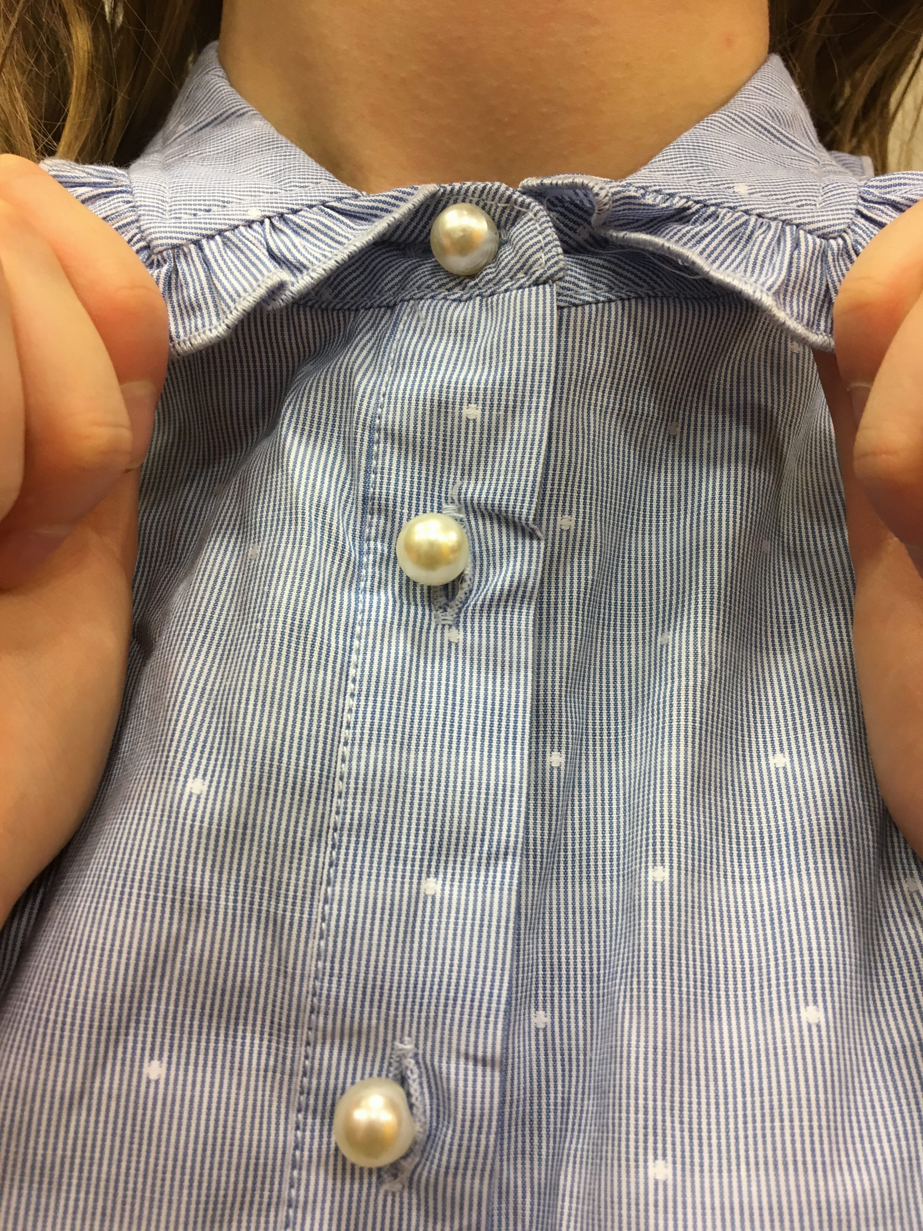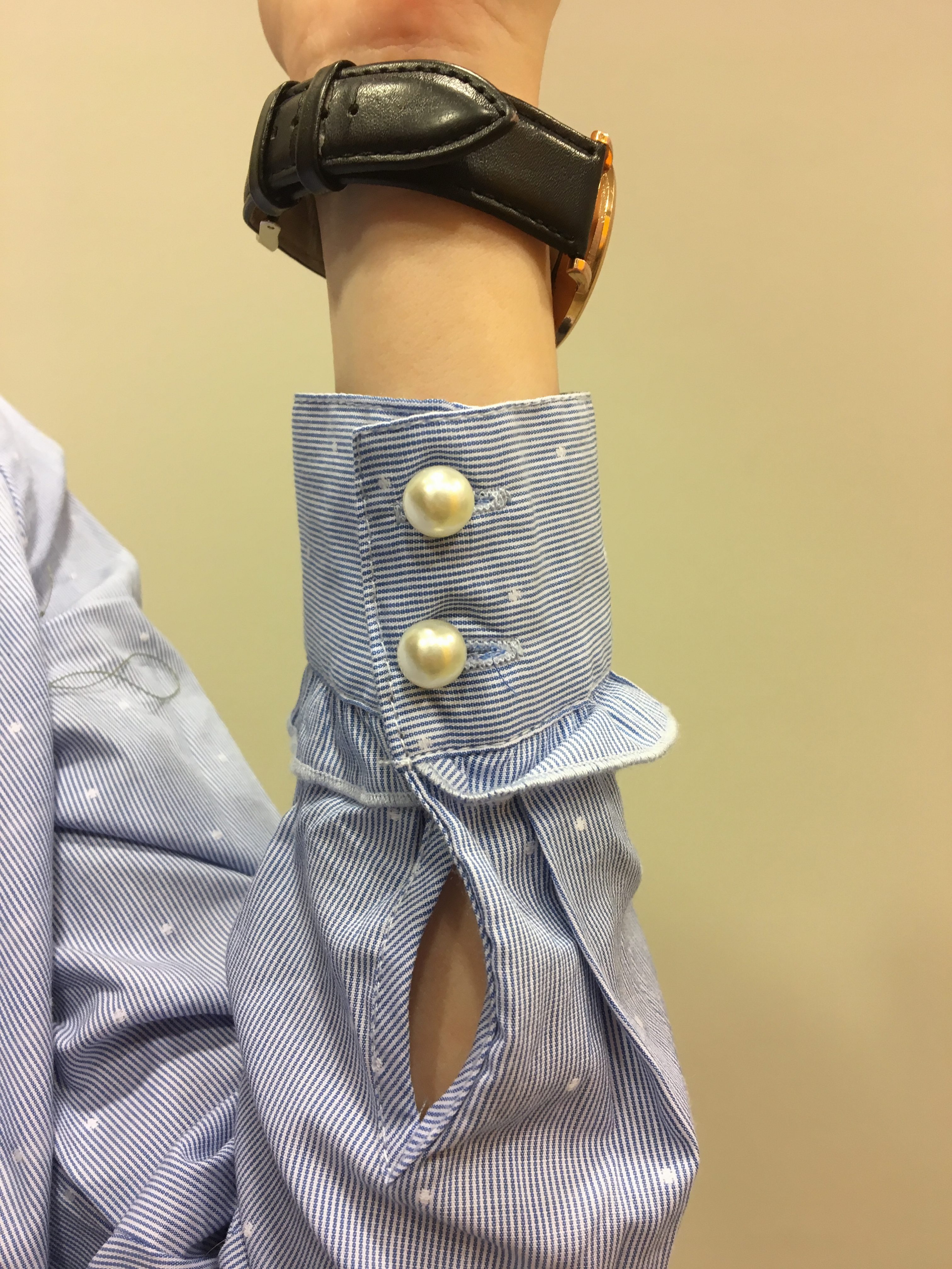 On a toujours besoin d’une chemise dans sa garde robe. Surtout si c’est une chemise NAF NAF. Qu’elle soit portée légèrement ouverte et ample pour un look chic et décontracte ou totalement fermée, près du corps pour être élégante et mystérieuse, la chemise reste un indispensable. J’ai opté pour une chemise NAF NAF à pois aux rayures discrètes bleu ciel et blanche. Elle a des perles en guise de boutons et le col est légèrement volanté. Je la trouve bien travaillée dans ses détails. C’est ce qui fait son charme et son authenticité.