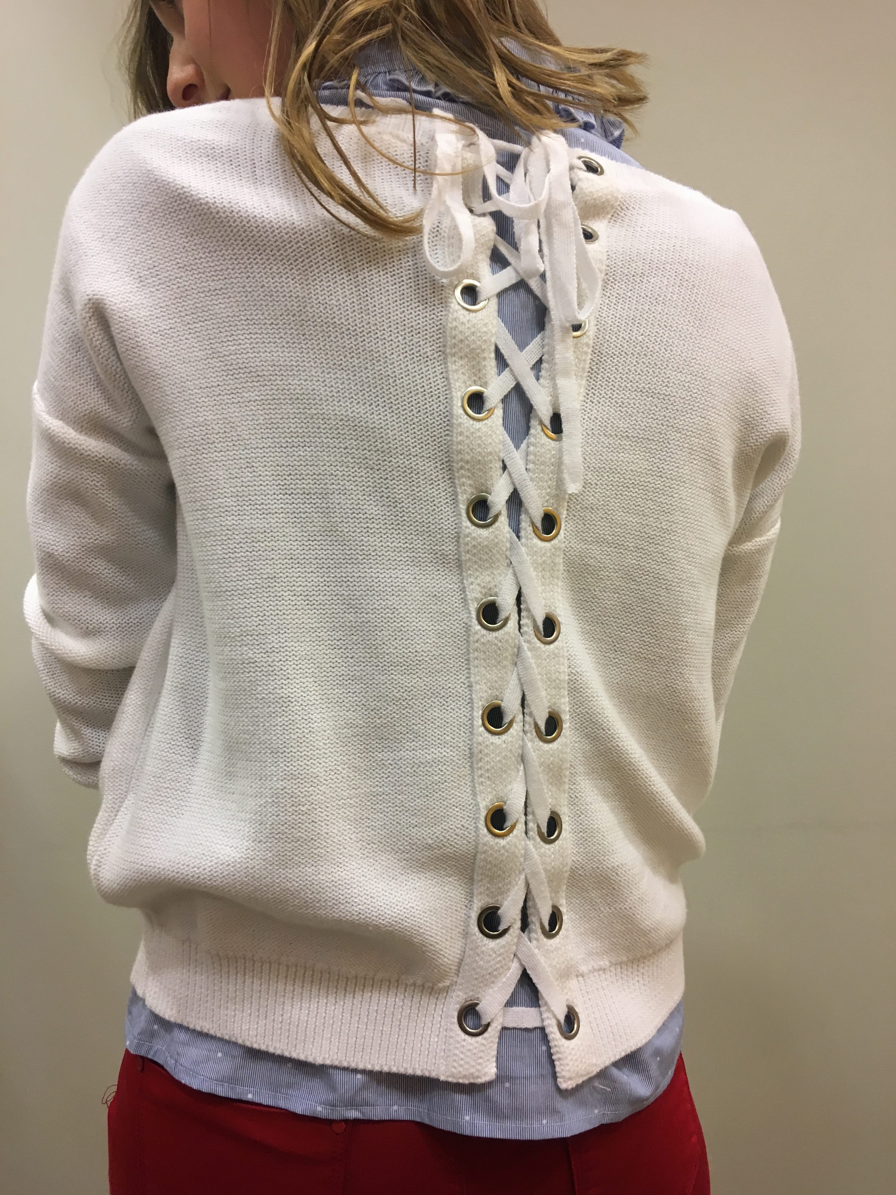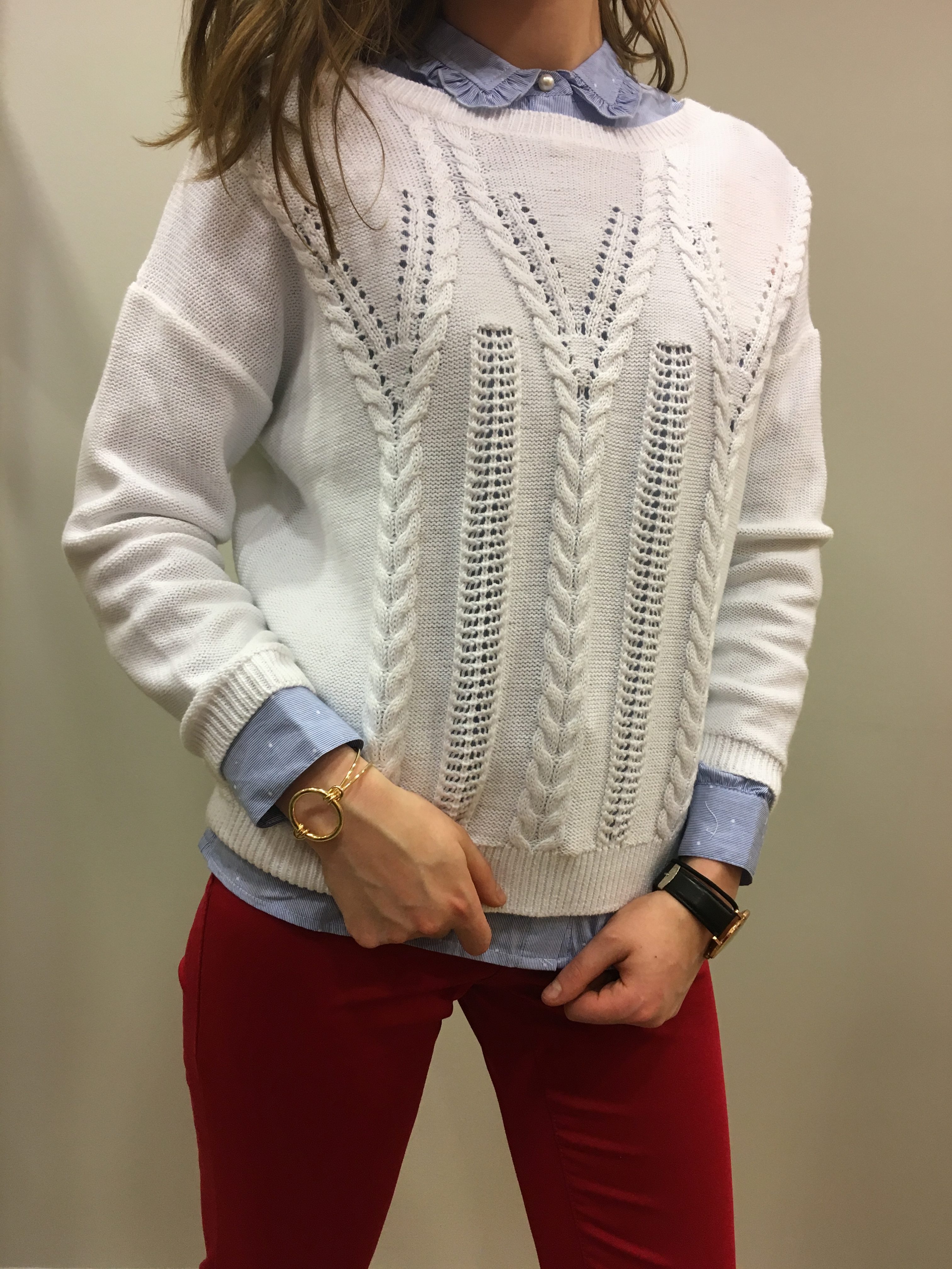 L’hiver n’est toujours pas fini mais quelque part c’est une chance. Pourquoi ? Parce que j’aime beaucoup porter mes chemises avec des pulls comme avec ma jupe tutu. C’est donc ce pull composé de coton que j’ai choisi de porter au dessus de ma chemise. Il est blanc avec des torsades sur le devant. Il y a également un laçage dans le dos. Je ne suis pas fan du pull seul mais les deux ensemble… J’adore !