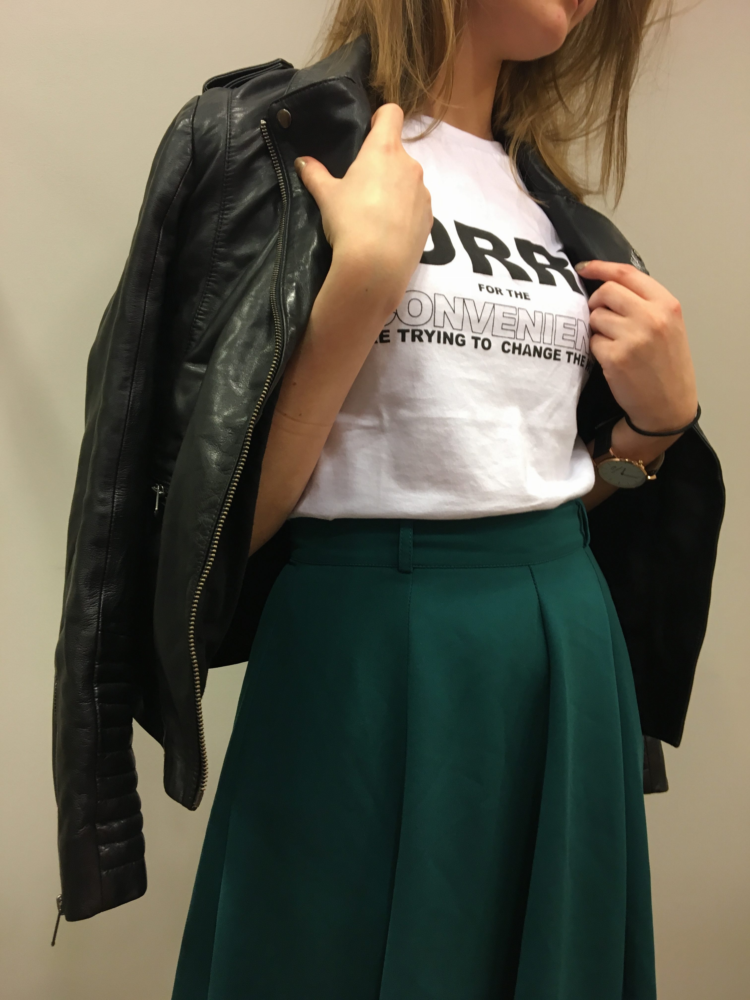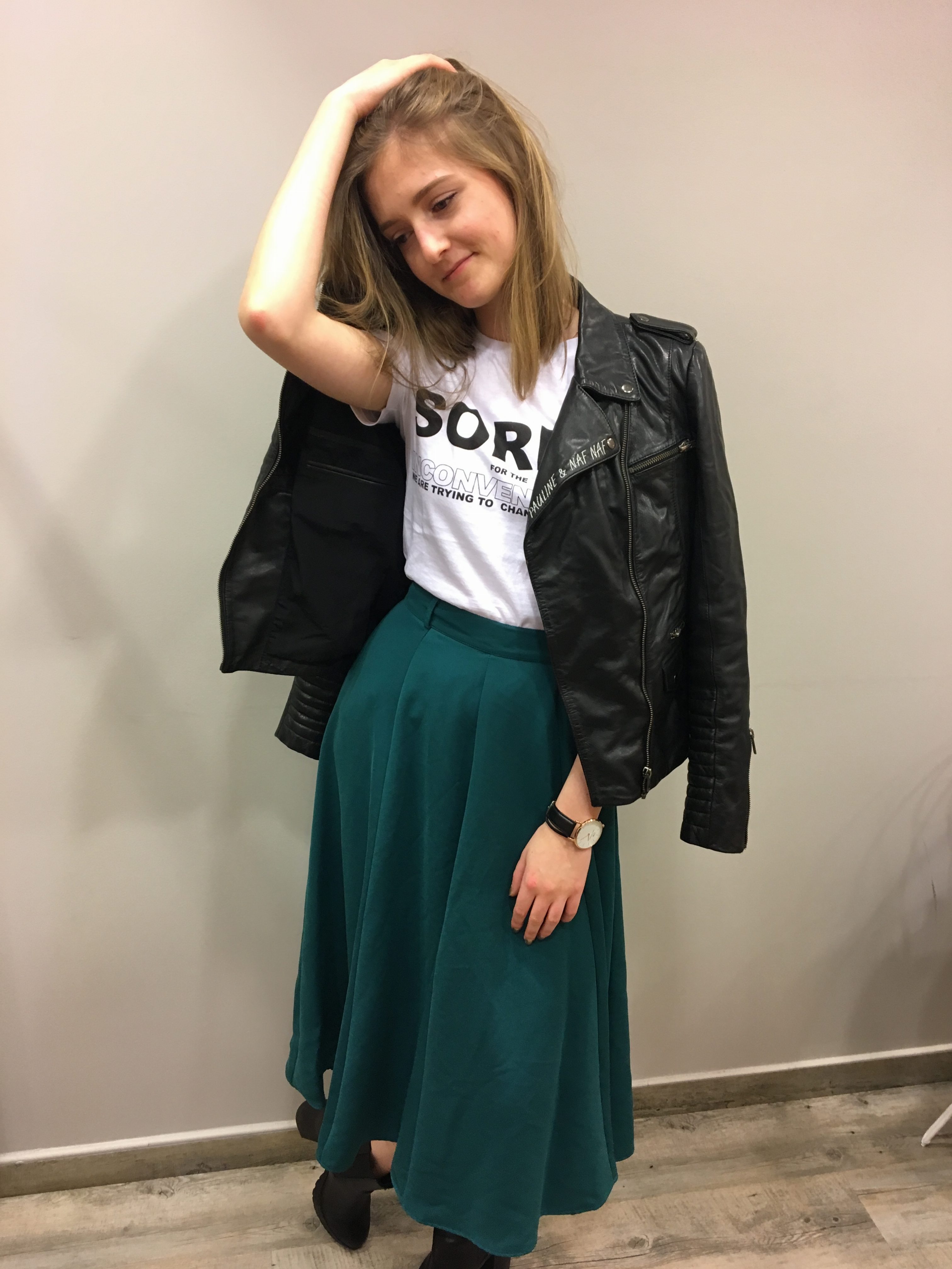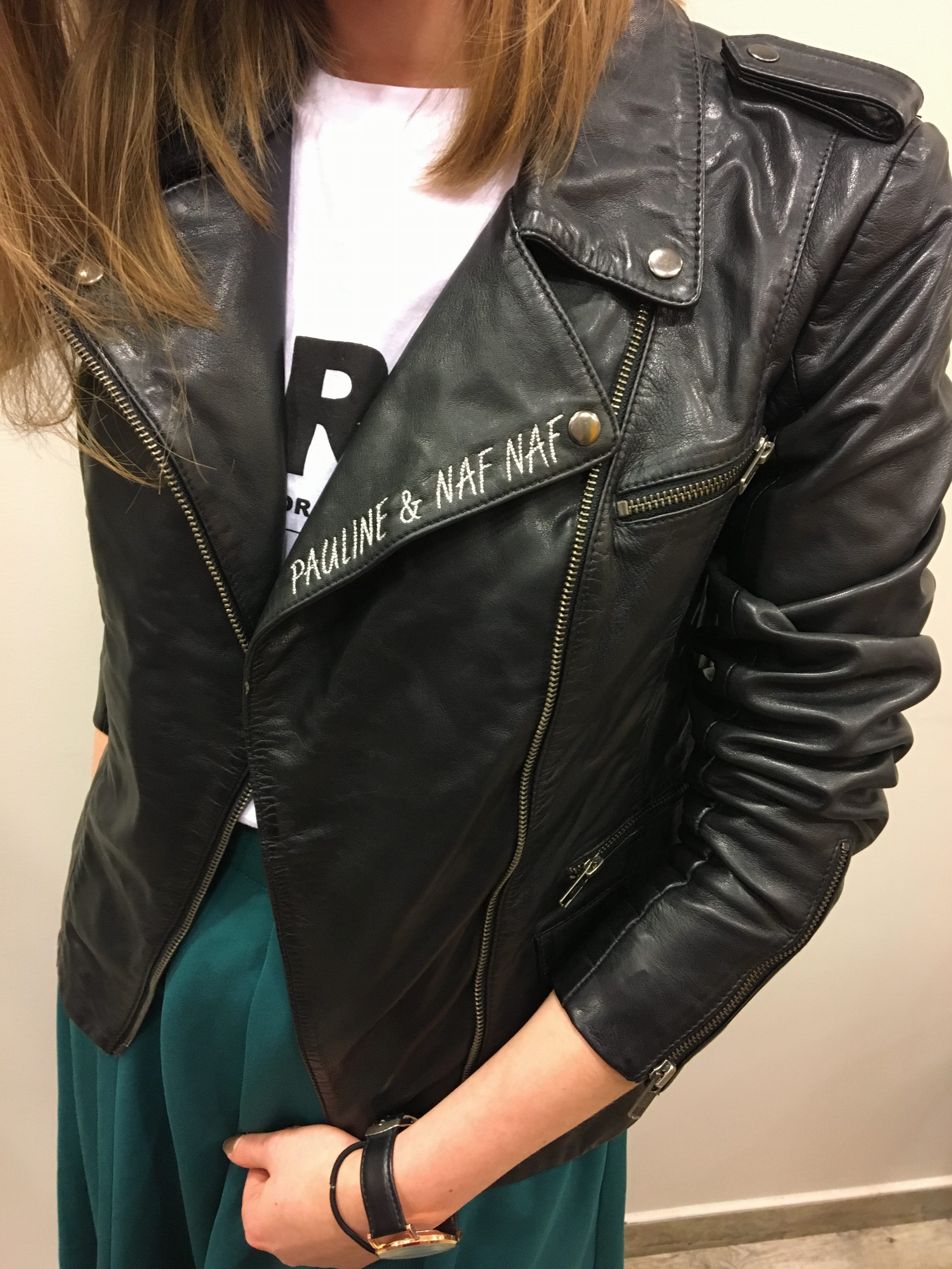 C’est un cuir noir coupe biker cintré à la taille et resserré aux manches. Les manches sont légèrement matelassées. Vous avez deux boucles sur chaque côtés du bas du cuir. C’est sans trop d’hésitation que j’y ai inscrit « PAULINE & NAF NAF ». Pas très original vous me direz. Je voulais que ce cuir soit symbolique, qu’il scelle mon attachement à la marque. J’aurai pu y mettre mon nom de blog, mais avant d’être PO’ on the LINE, je suis Pauline tout court.