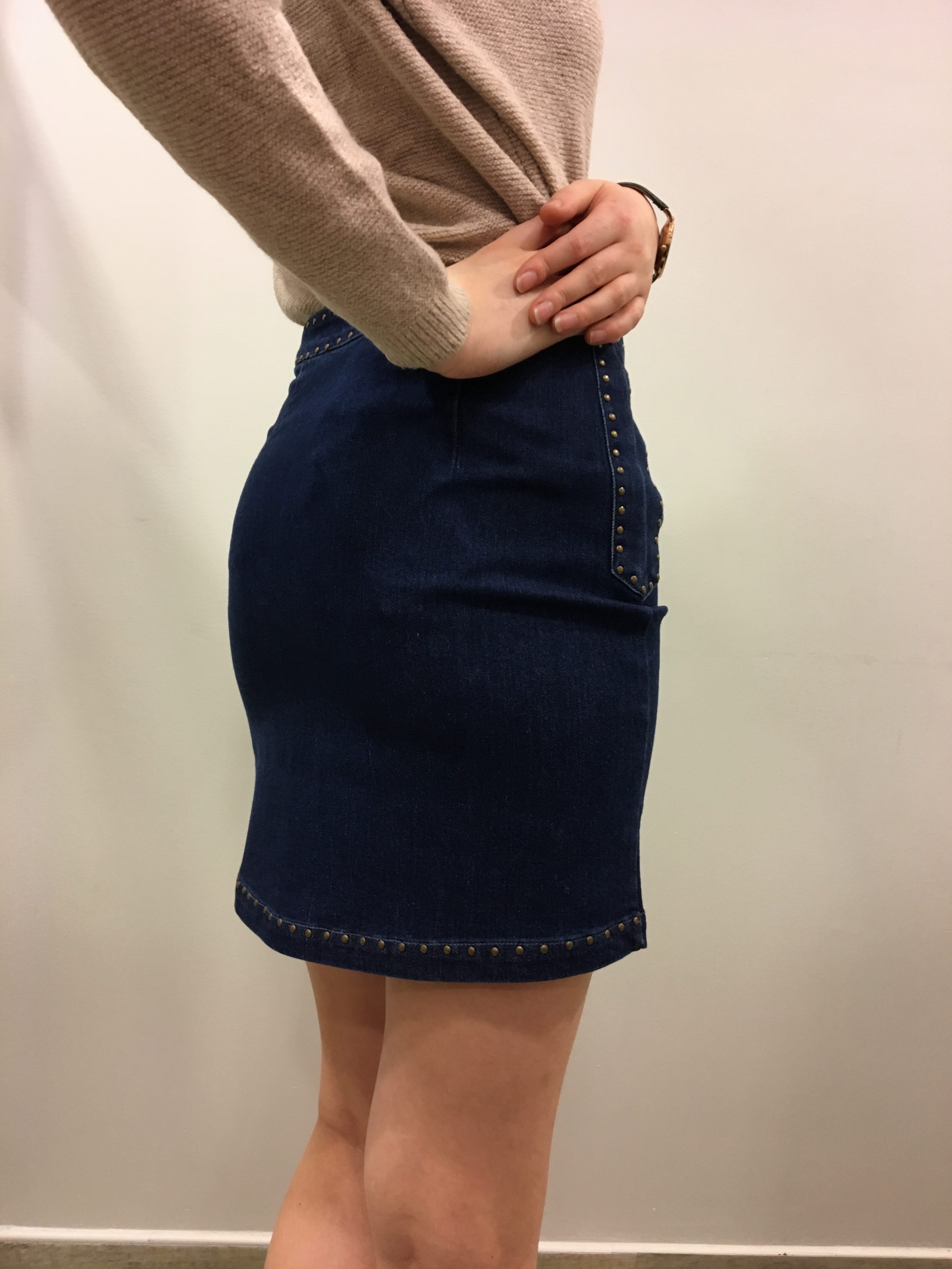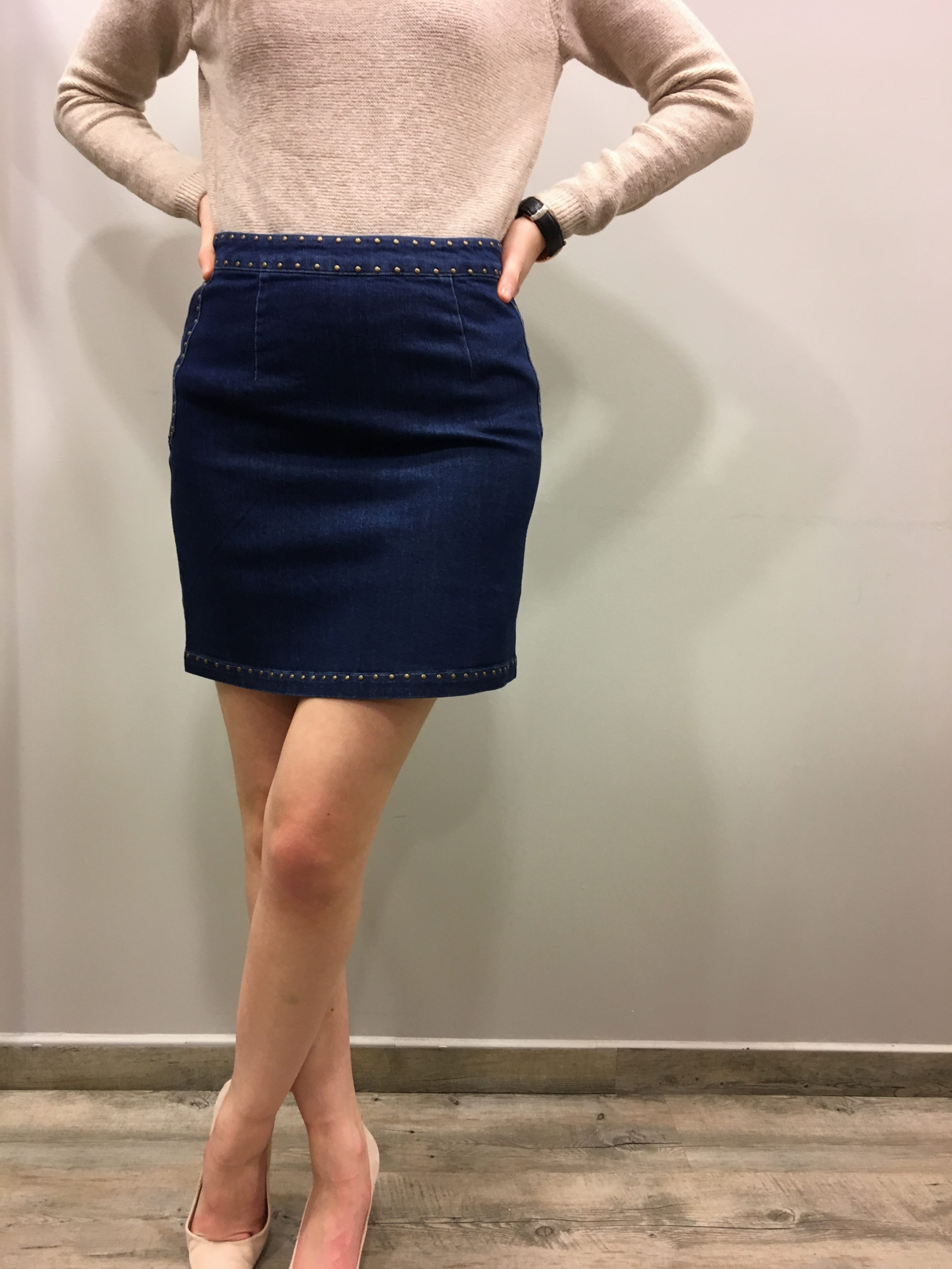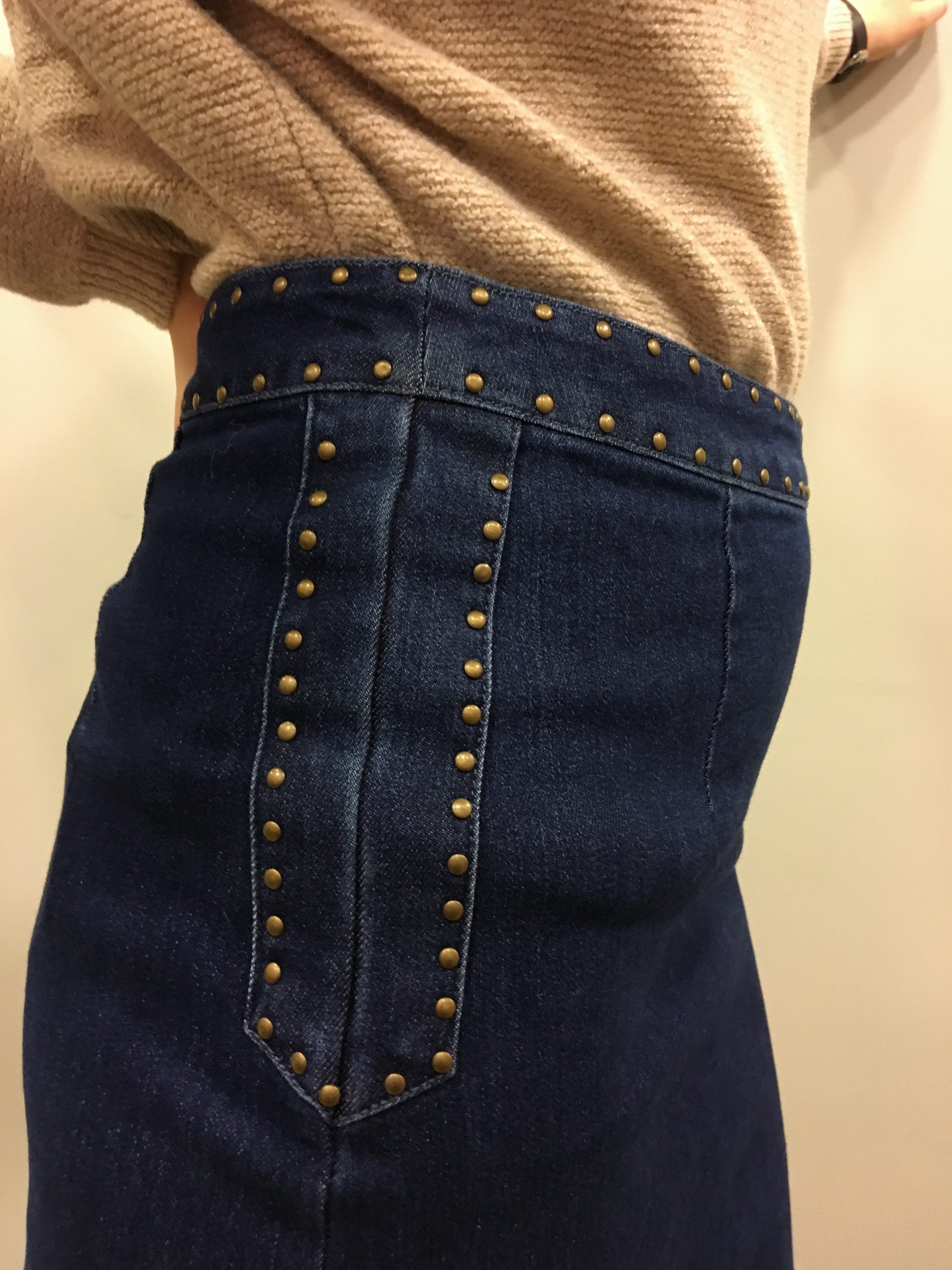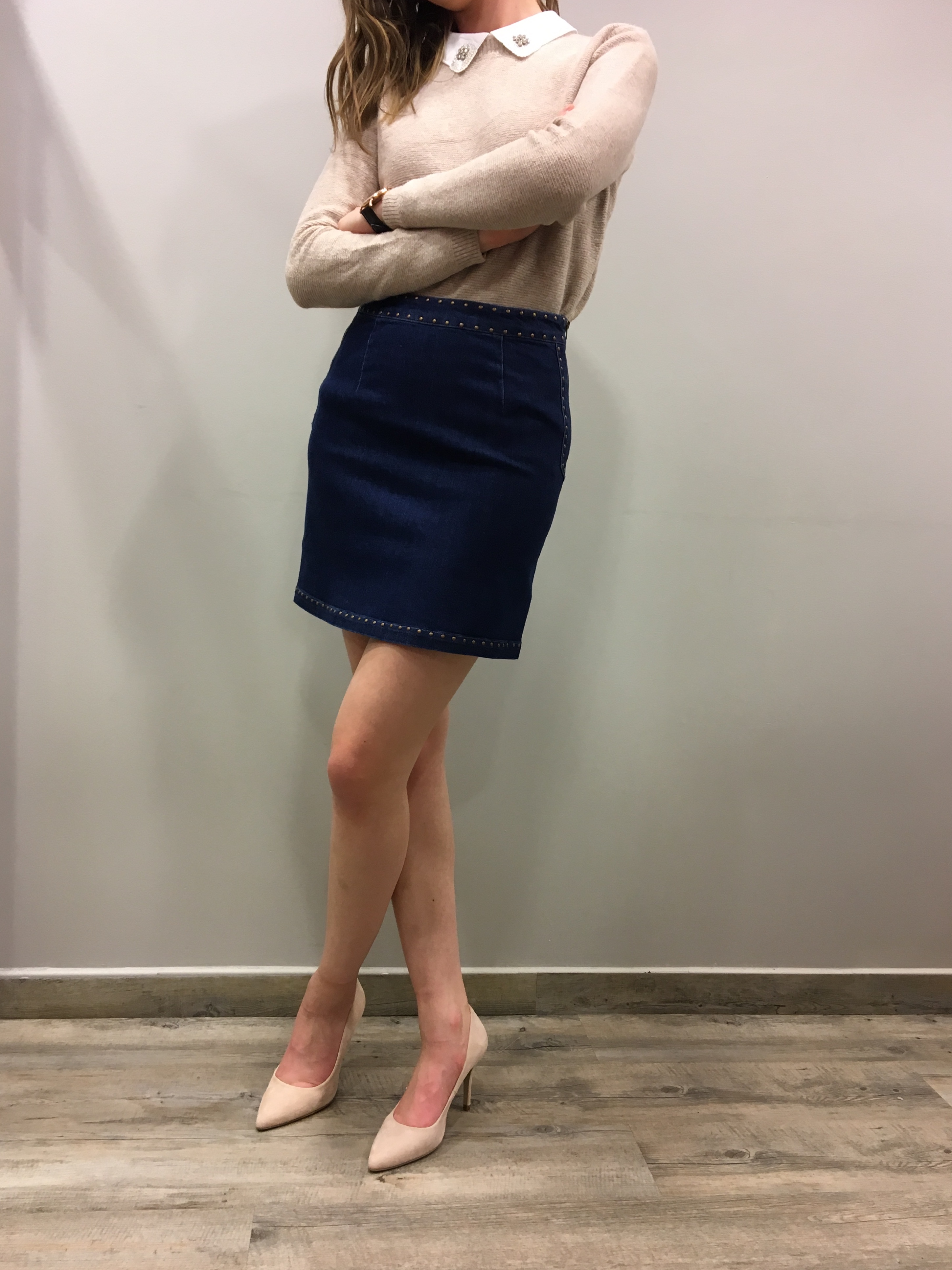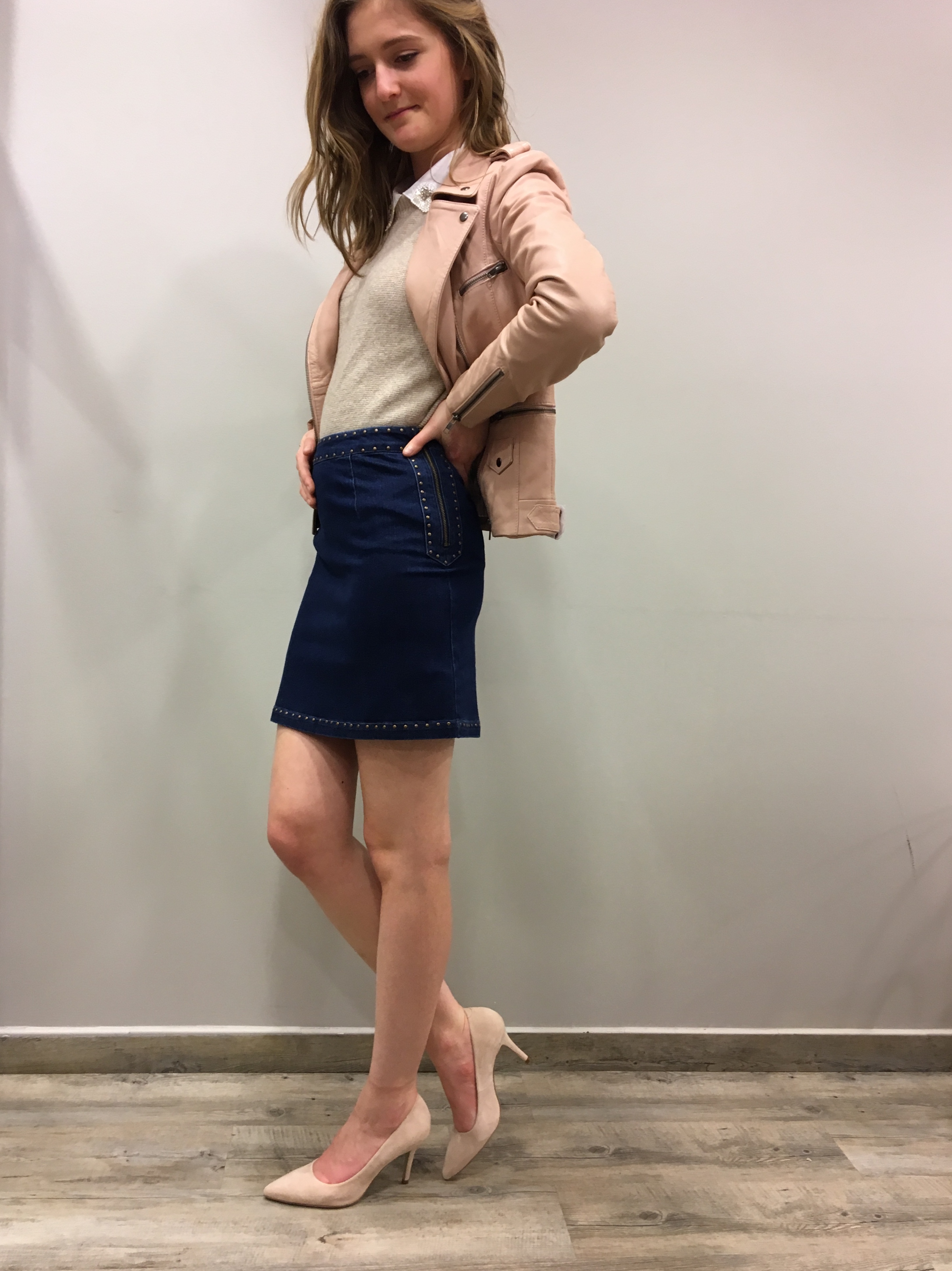 Le jean sera bien présent pour la tendance mode printemps-été 2018. Et le jean sous toutes ses formes ! Ici j’ai choisi cette petite jupe en jean. Elle est droite et épouse la forme de vos hanches. J’aime beaucoup le détail des petits clous sur les contours de la jupe qui dessinent la jupe.