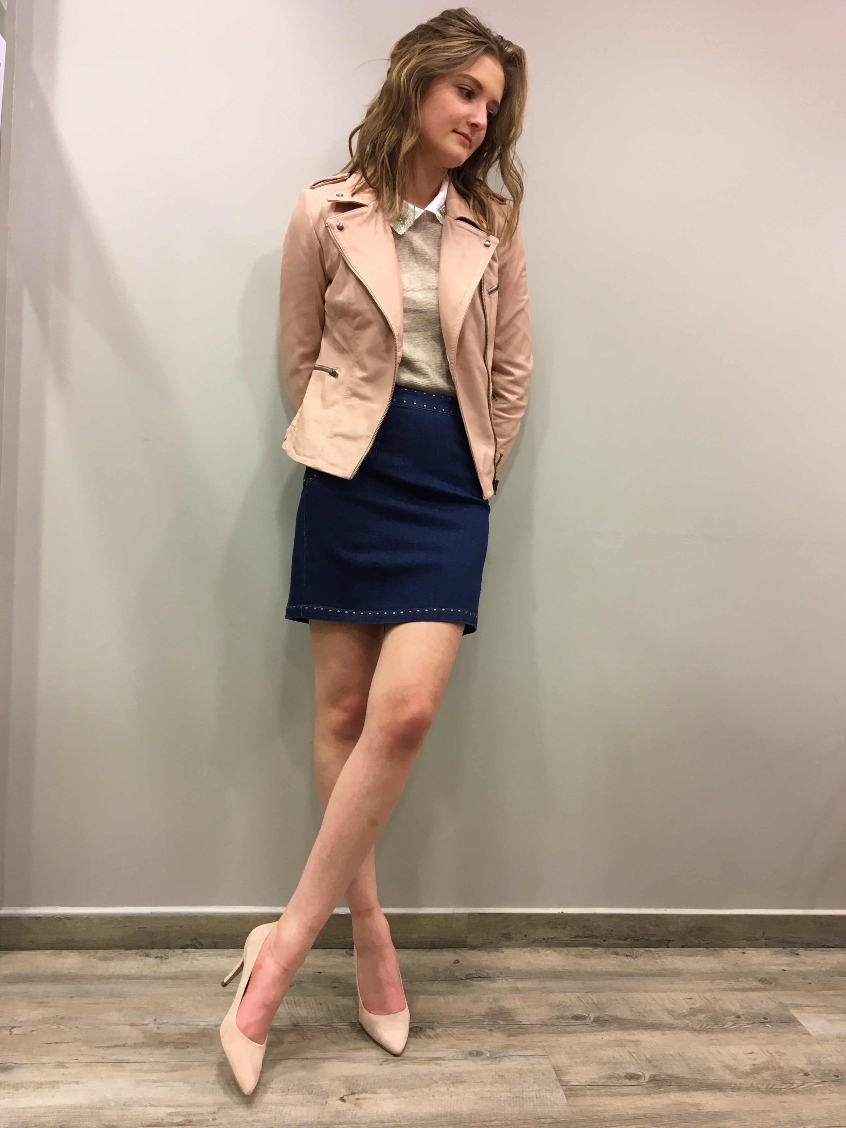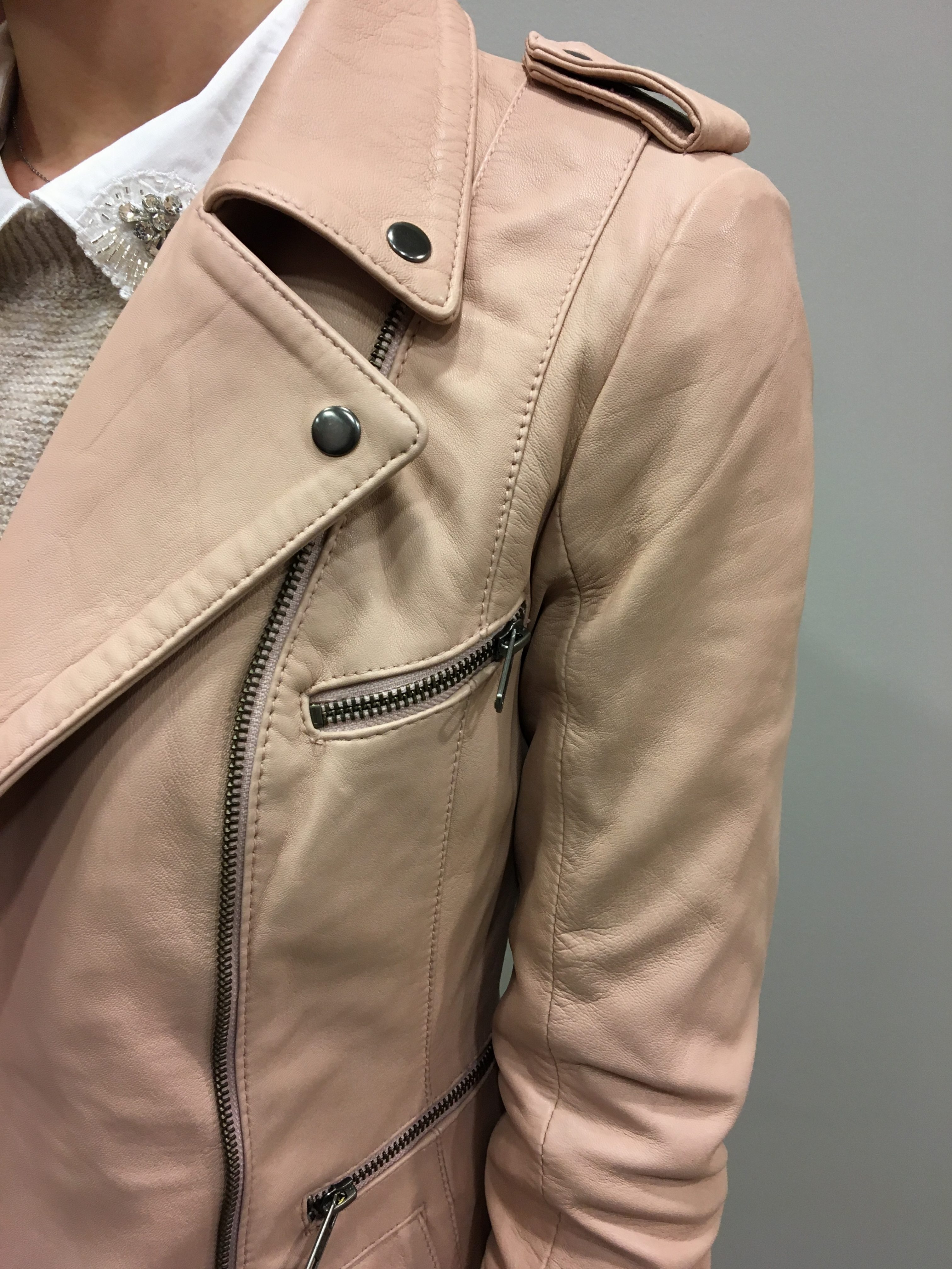 Le cuir : un intemporel, un indispensable, bref une pièce tendance à avoir dans son dressing. Pour ma part, je collectionne toutes les vestes en cuir d’agneau de NAF NAF. Il me semble vous avoir déjà montré le cuir lie de vin et même mon cuir personnalisé noir. Et cette fois je vous présente le petit dernier : le cuir nude. Regardez la douceur de la couleur qui contraste avec la coupe biker. Ça le rend vraiment très féminin et c’est ce qui m’a fait craquer !