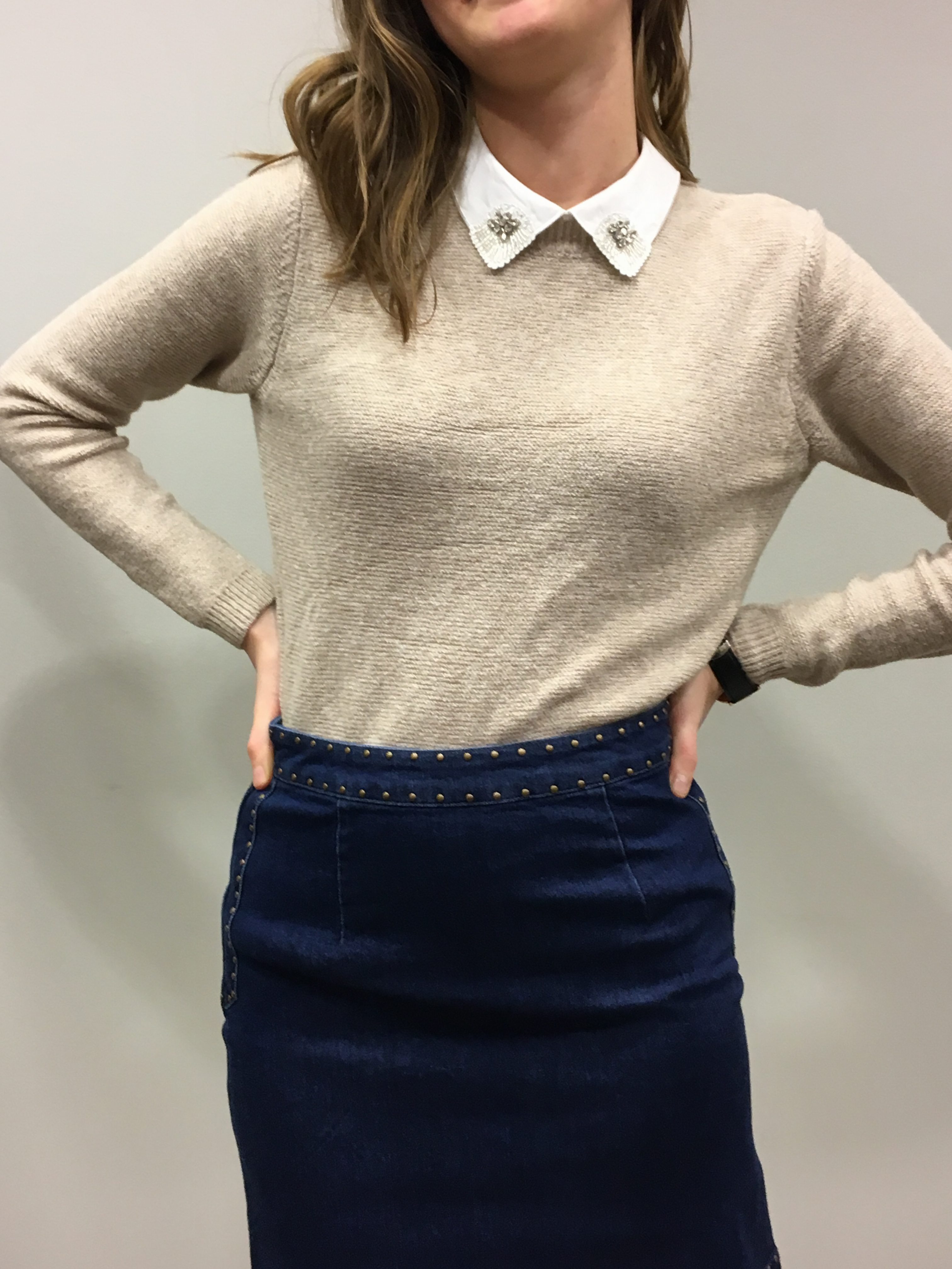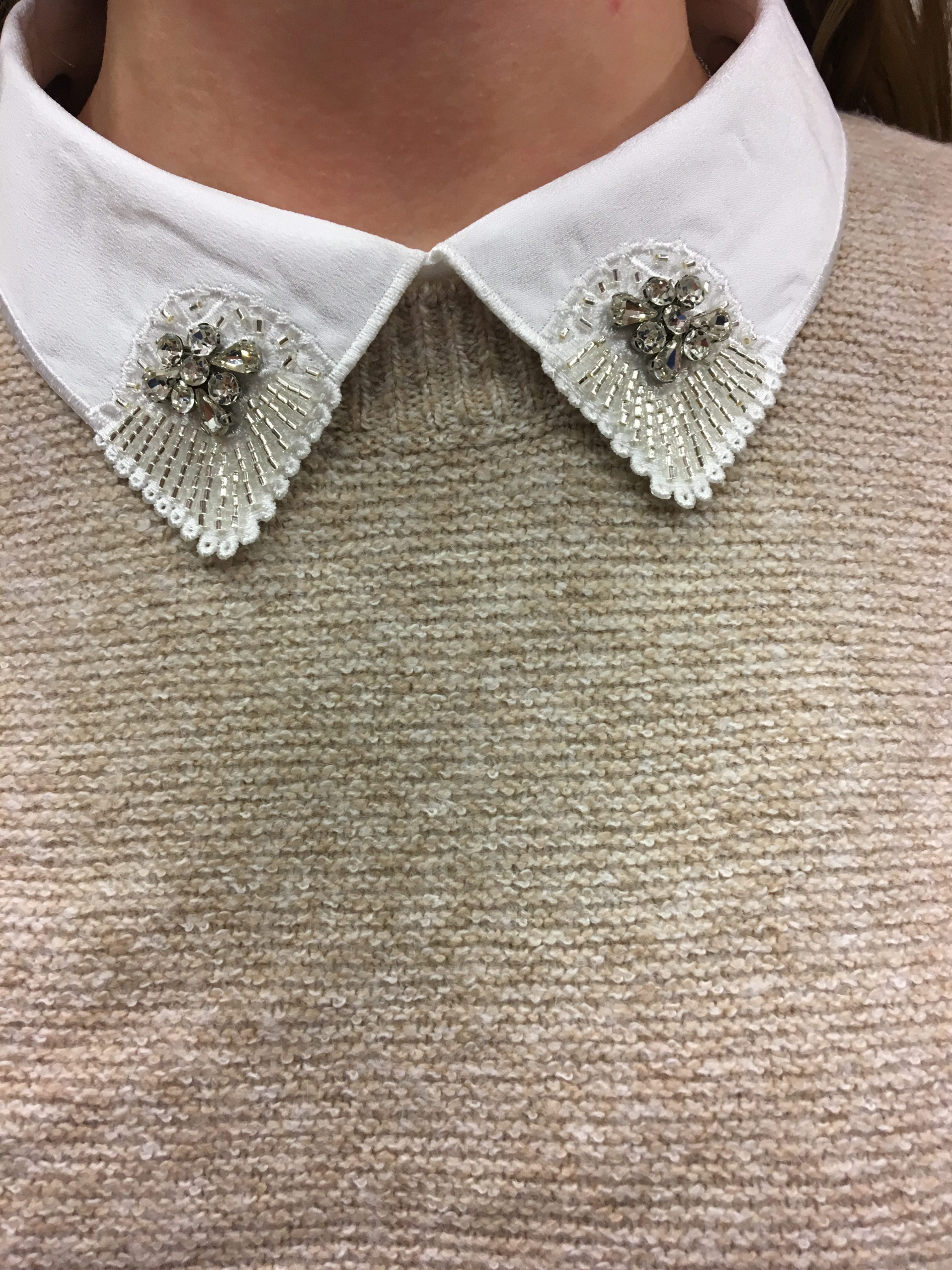 Le froid persiste et il faut se réchauffer ! Quoi de mieux que ce joli pull beige ? Il se porte près du corps. Il est tout doux et super mignon avec son col bijoux. Le bijou est cousu sur le col avec une sorte de broderie autour. Il reste simple avec une pointe d’élégance. D’ailleurs il existe en rose et en gris si vous voulez le trouver dans vos boutiques !