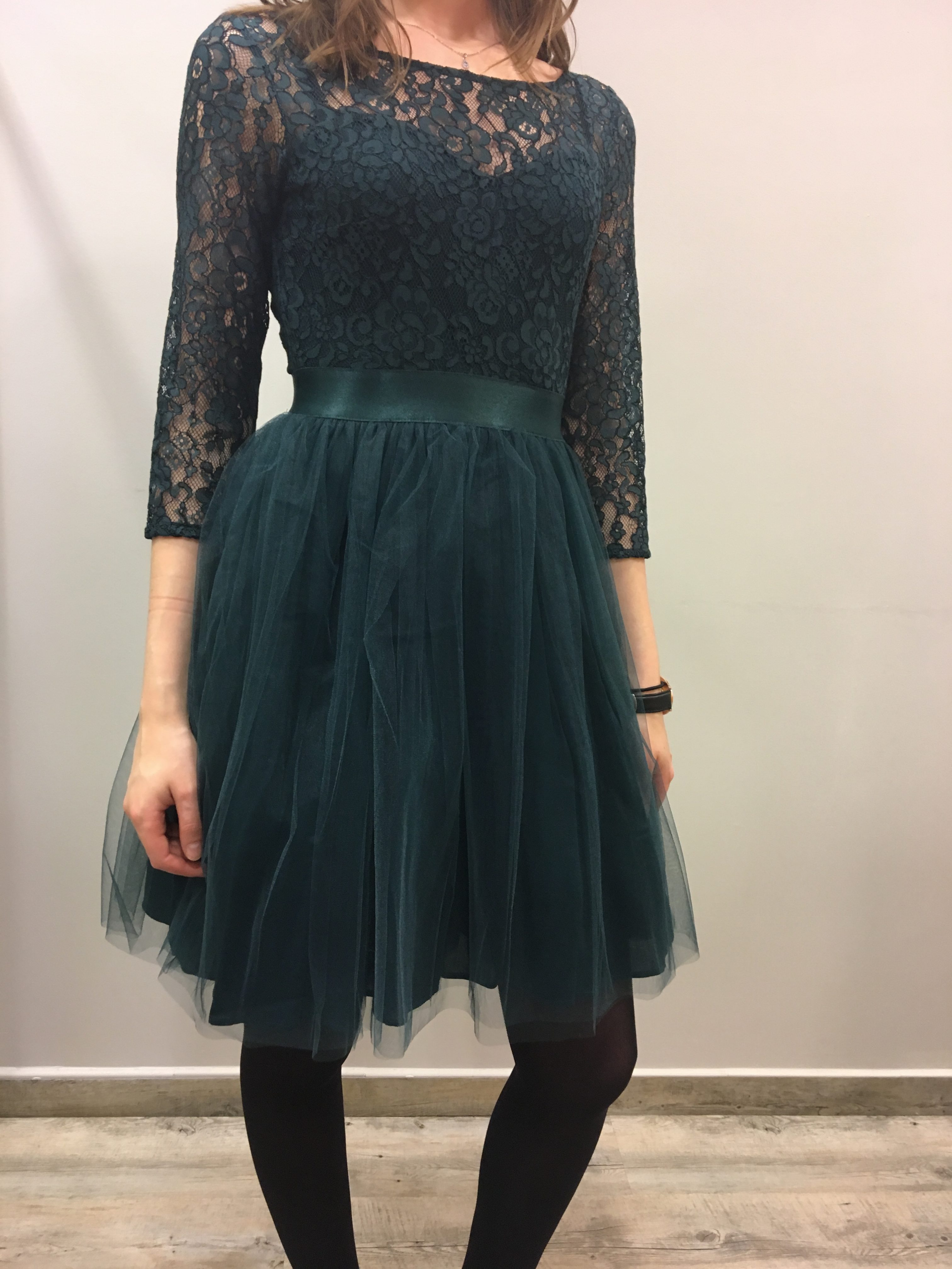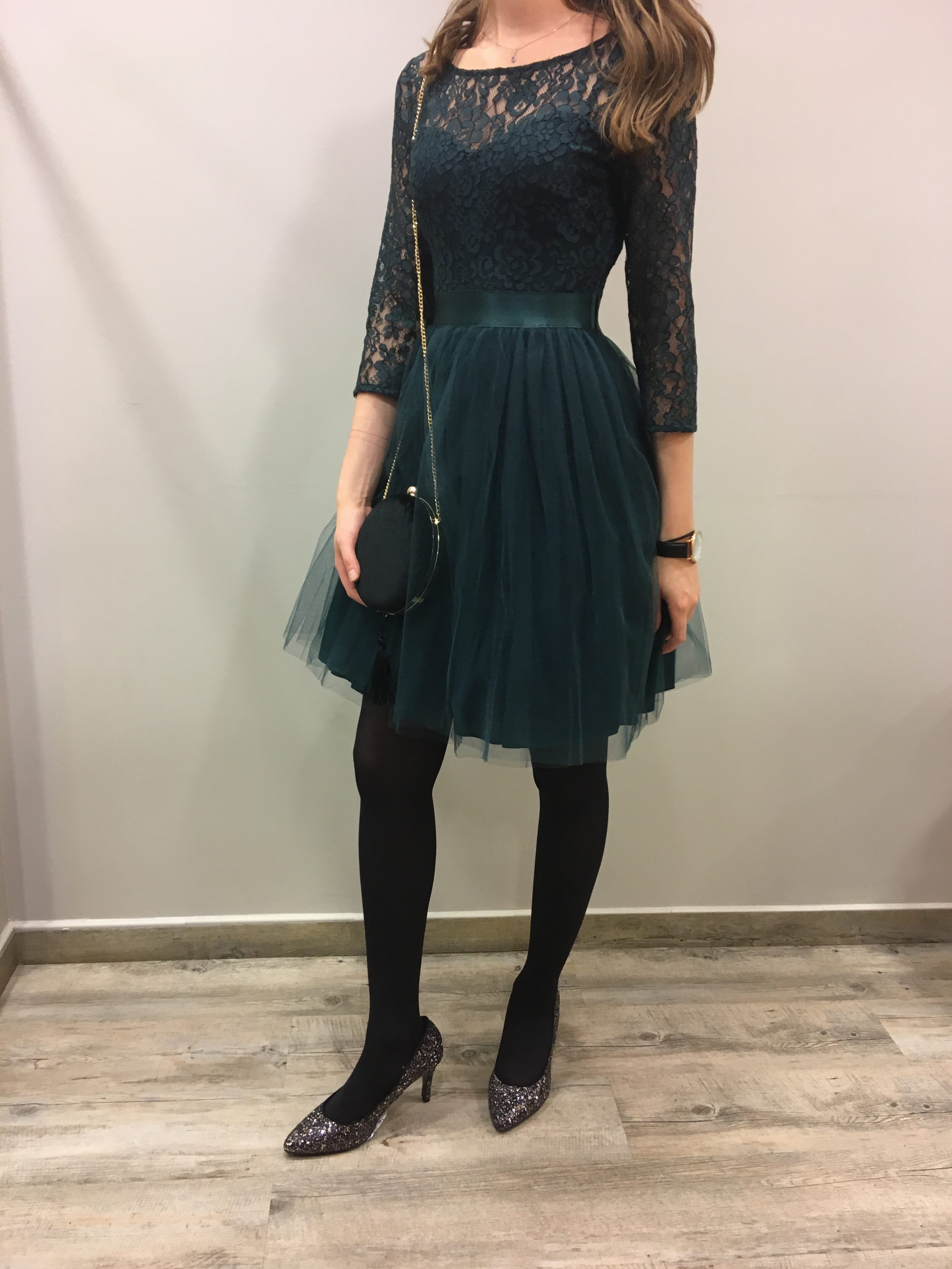 Les fêtes de Noël approchant à grand pas, il me semble approprié de vous présenter une robe pour Noël made in NAF NAF. Vous avez un haut bustier qui laisse apparaitre votre peau sous de la dentelle qui recouvre votre dos et vos bras jusqu’à vos coudes. La jupe de la robe est en tulle, rien de mieux pour donner du volume ! Et il y a un joli ruban de soie au niveau de la taille qui sépare les deux matières.