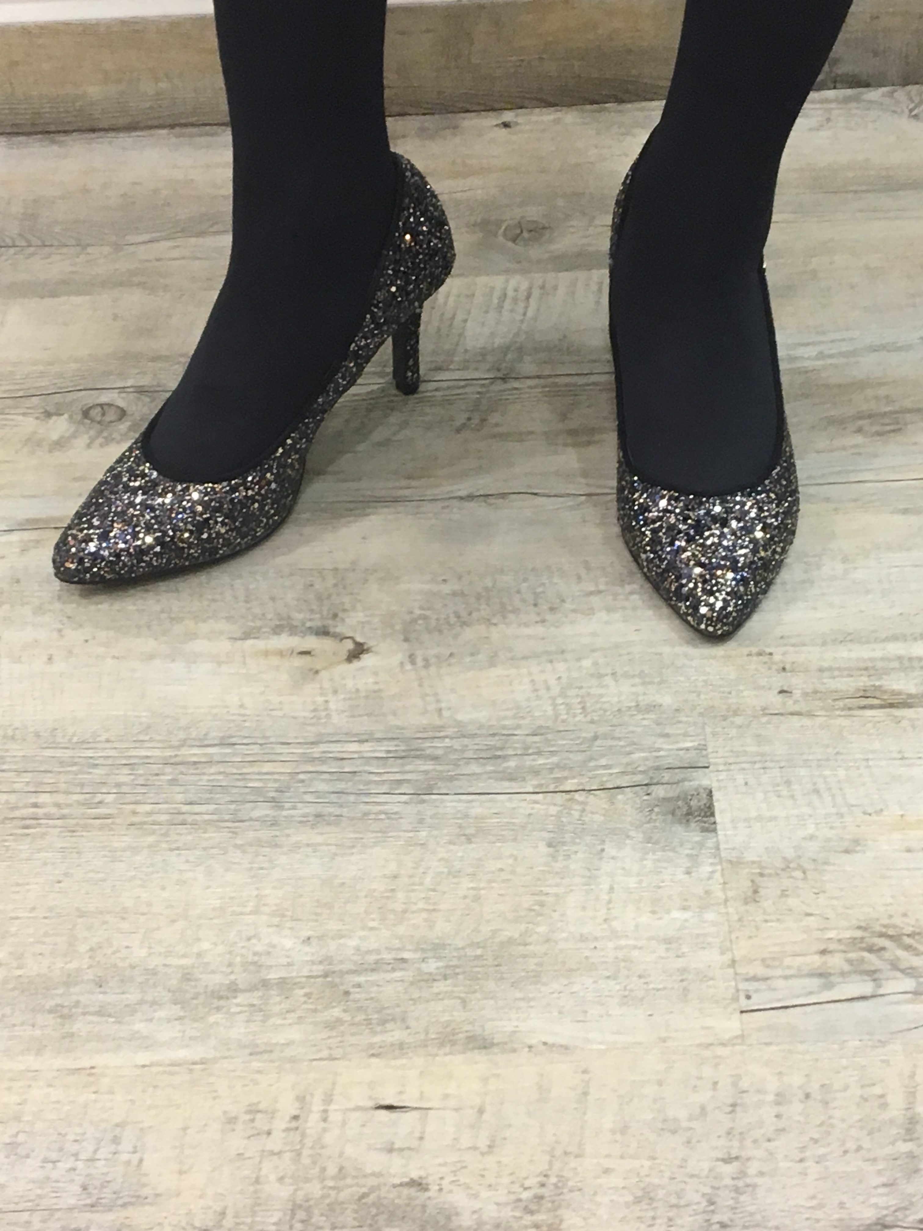 J’ai accessoirisé la robe avec des escarpins pailletés. Et oui, on est une princesse ou on ne l’est pas ! Il faut illuminer, je dirai même éblouir la pièce dans laquelle vous vous trouvez ! Vous vous dites « Ok, on va acheter des escarpins paillettes, mais quand est-ce qu’on les remettra ?! » Je vous remercie d’avoir posé la question. Portés avec une tenue non festive, les escarpins seront l’accessoire original de votre tenue !