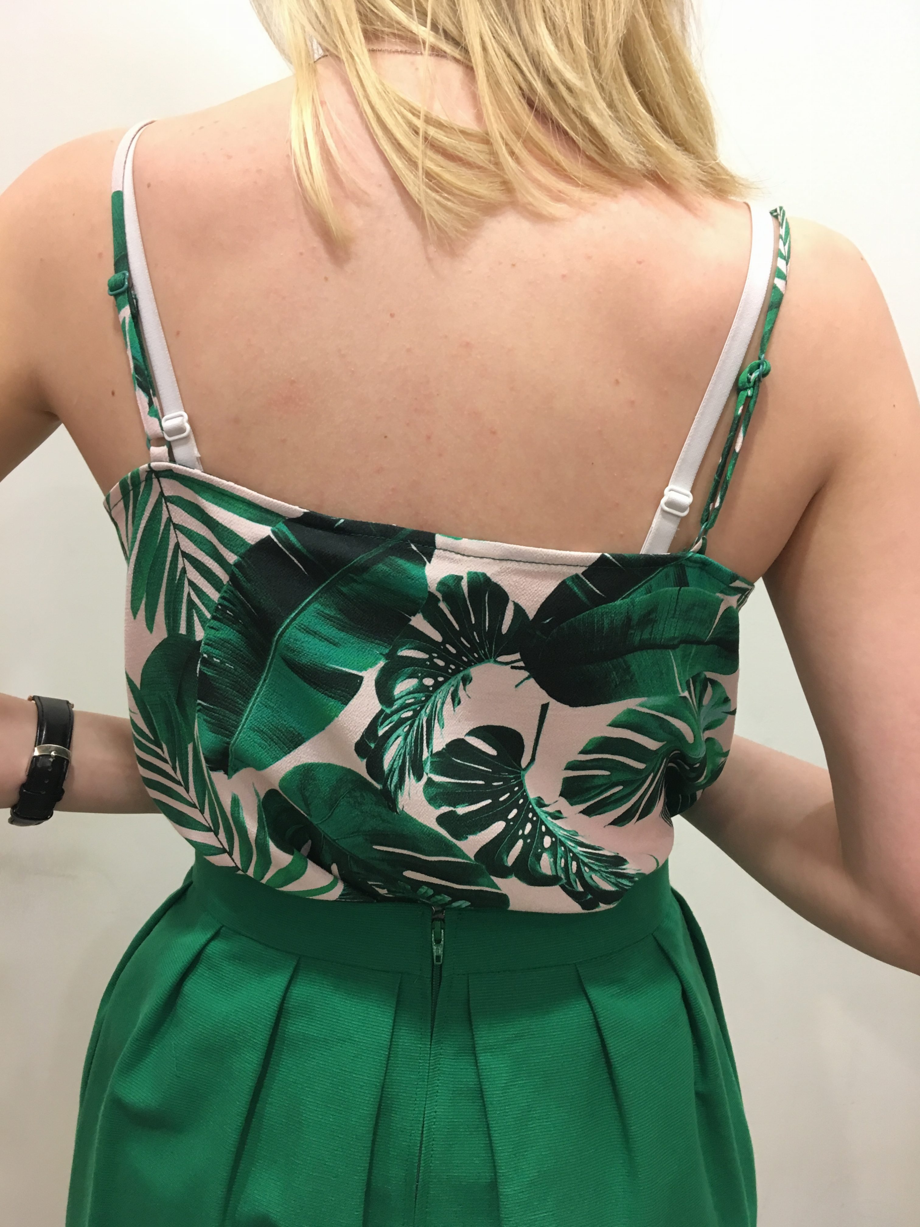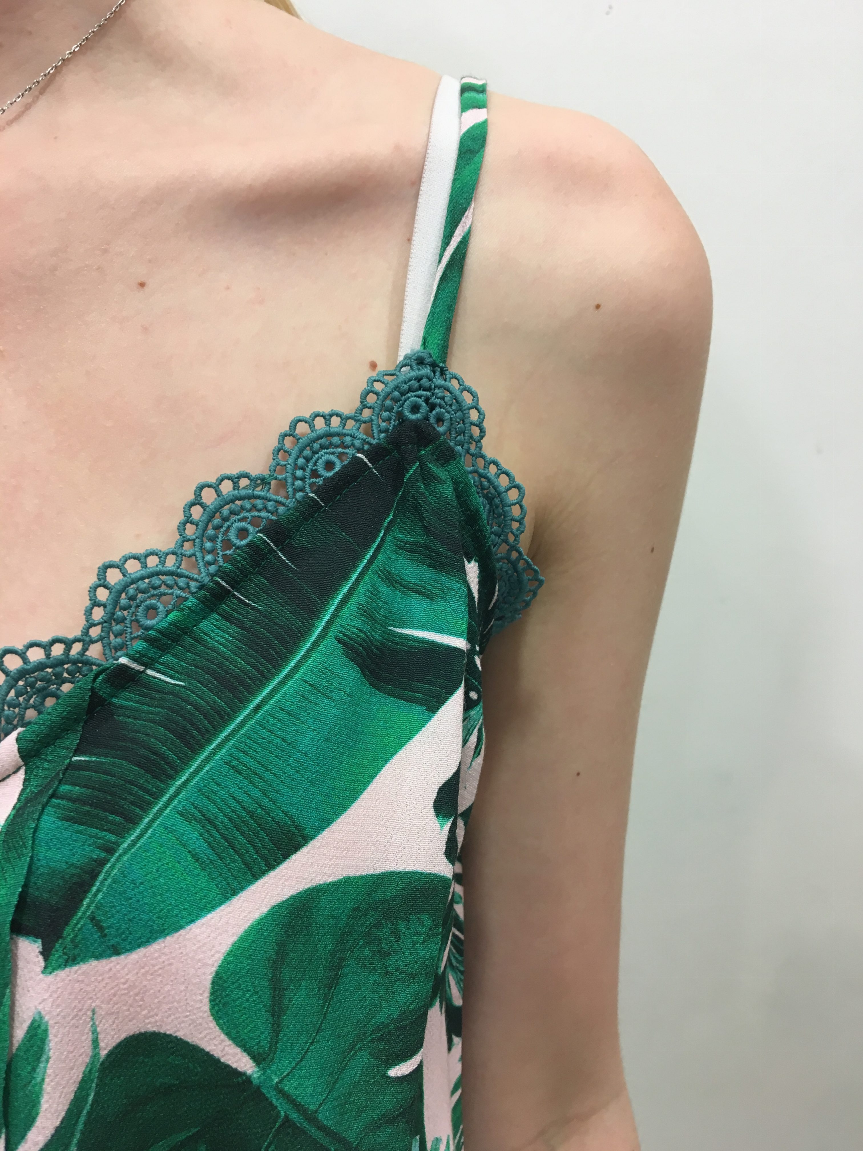 Plus besoin de voyager pour se sentir en vacances. Comme je l’ai consigné dans mon article sur ma jupe mauricienne provençale : c’est à travers la mode que je voyage. Il m’arrive de voyager dans le temps comme avec mon trench rosaline mais aussi à travers le monde direction l’imprimé tropical. C’est la tendance indispensable de cet été que l’on retrouve sur ce petit top effet chemisier. Cet imprimé tropical mélange le vert et le rose poudré, des couleurs sobres associées aux feuilles de palmiers imposantes. Il regorge de féminité avec son décolleté orné de dentelle.