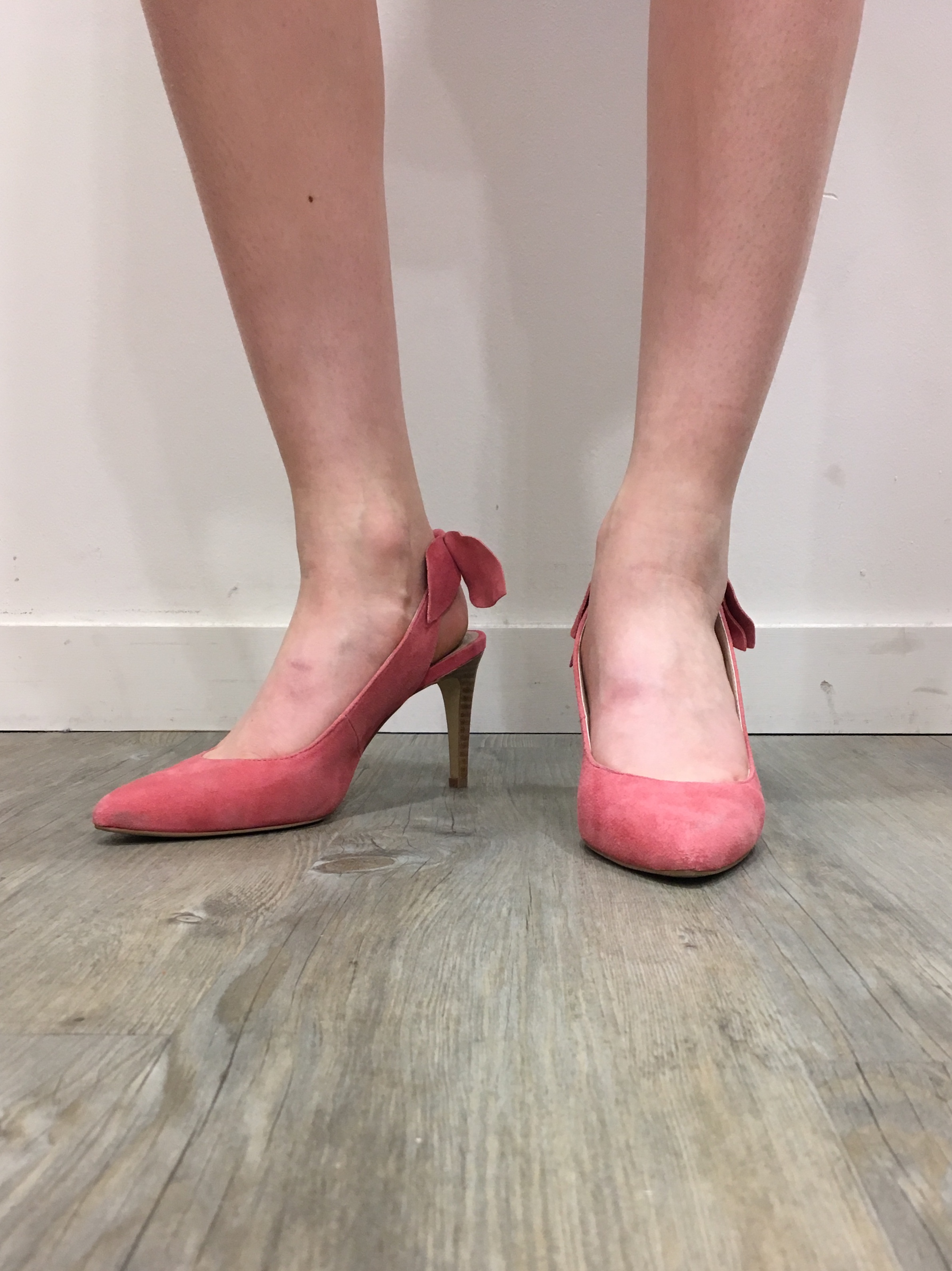 Et parce qu’on joue avec des déclinaisons de rose et de vert, j’ai finalisé le tout avec ces sublimes escarpins pêche de vigne ! Elles apportent de l’élégance et allongent vos jambes avec délicatesse. Elles vous rappellent quelque chose ? Oui, je les porte en bleu marine avec ma robe à bretelles. On n’a jamais assez d’escarpins !