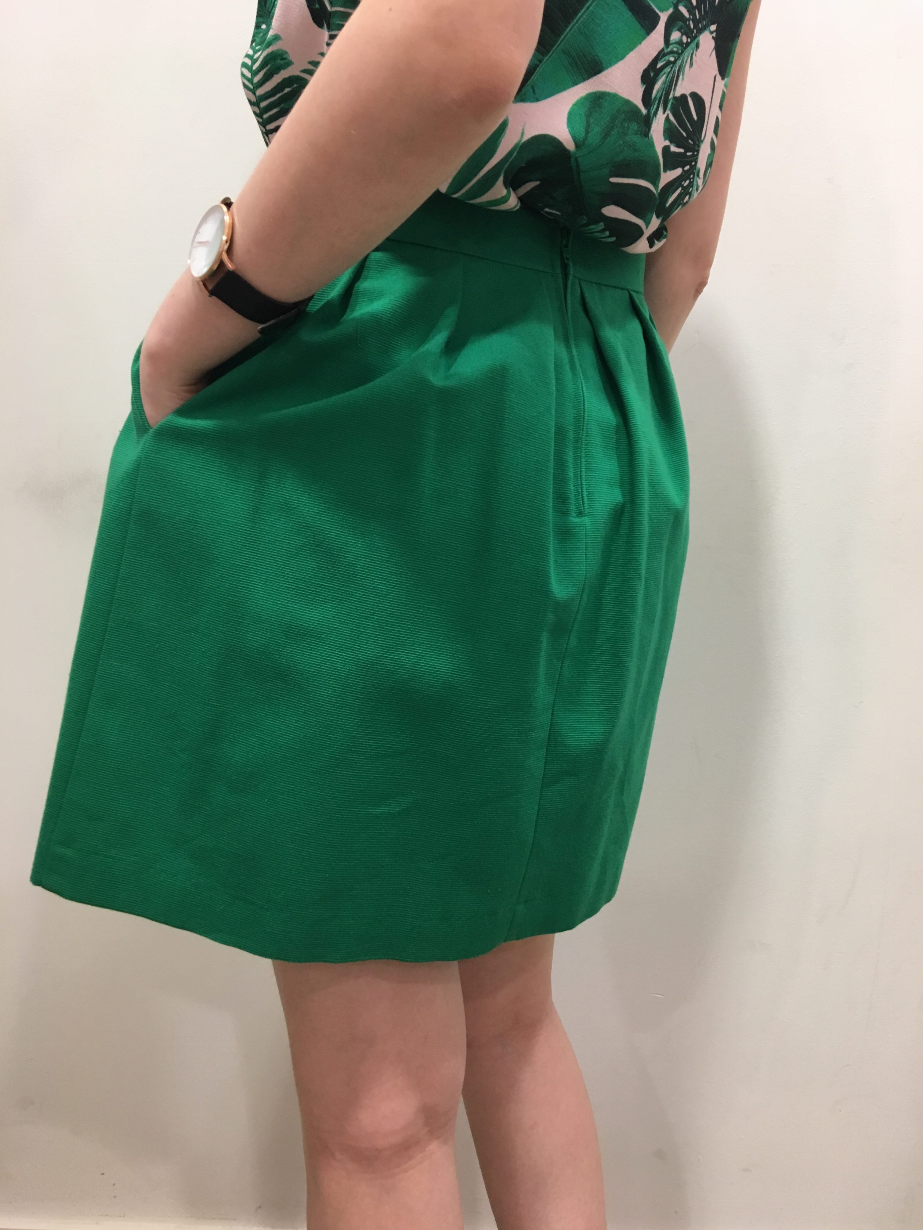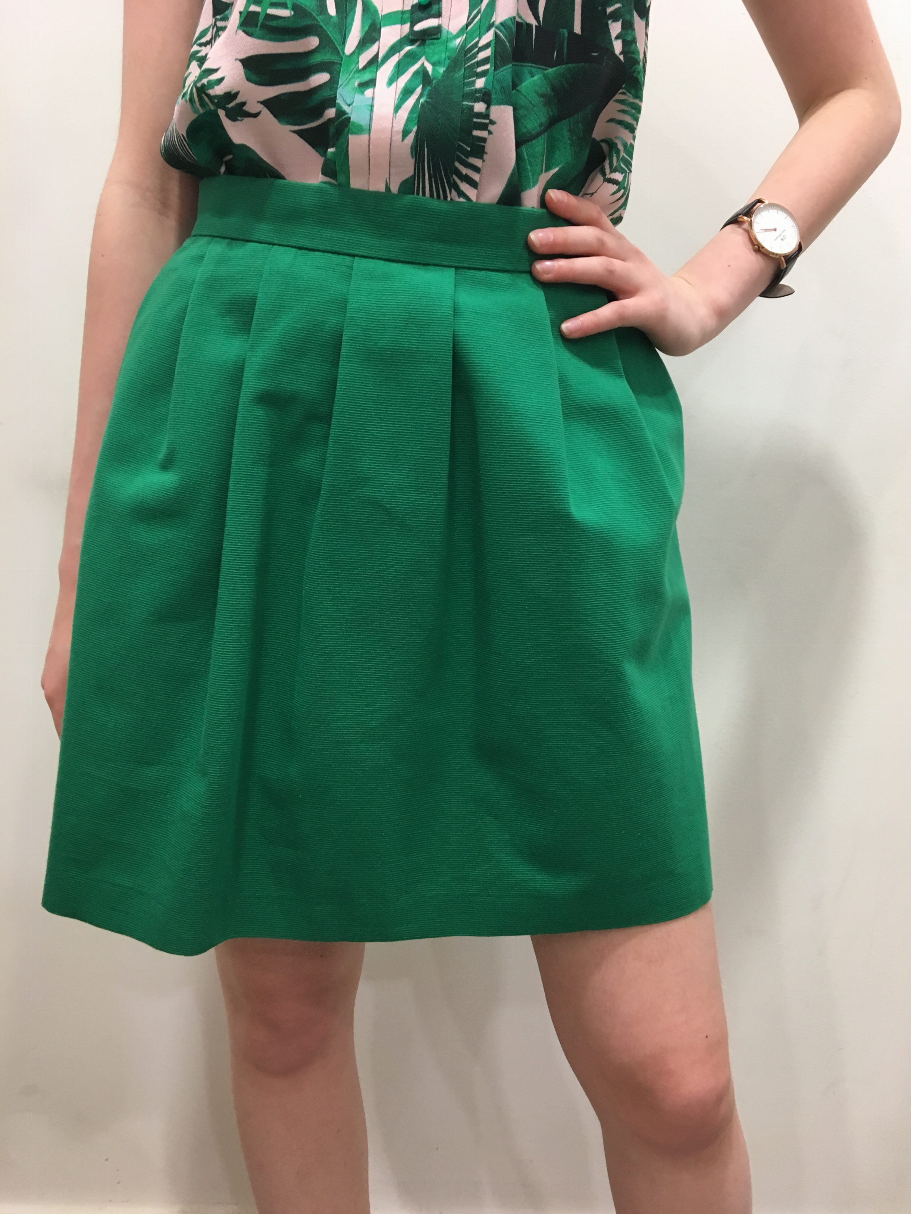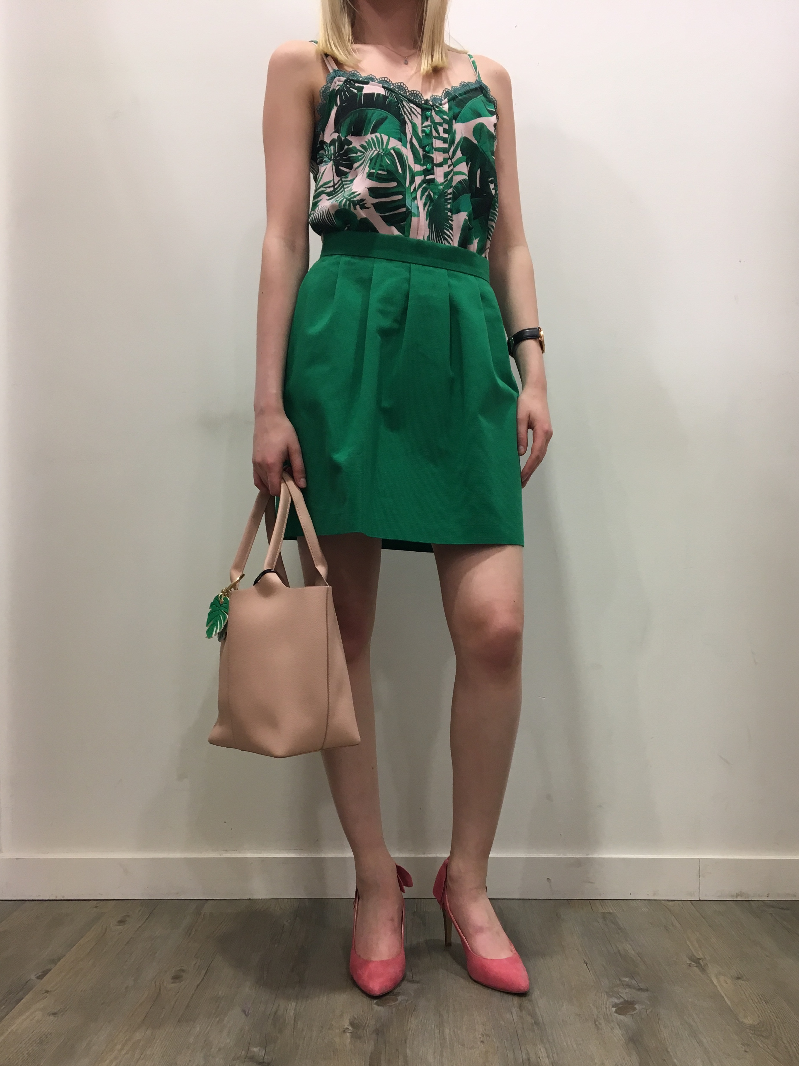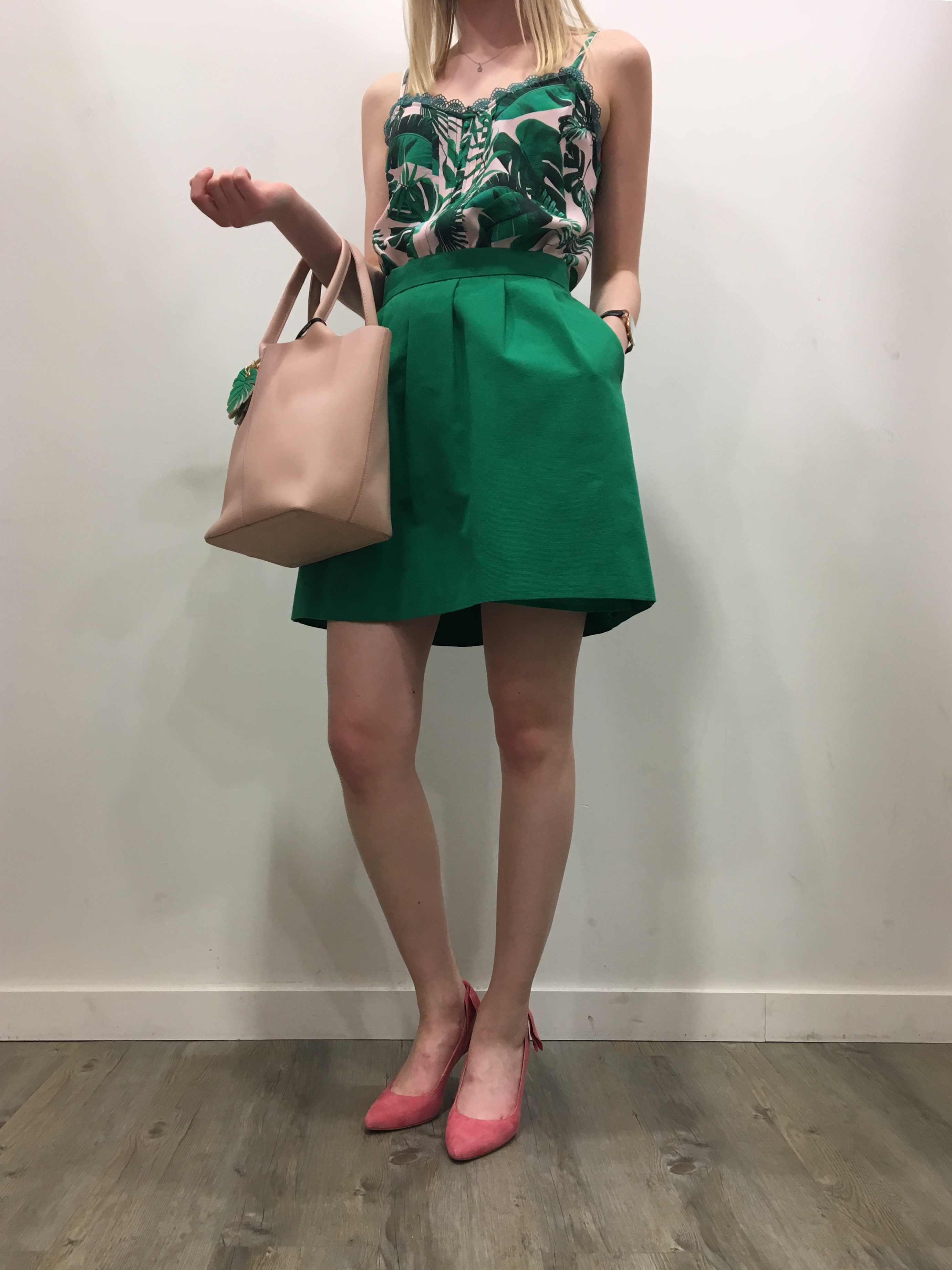 J’emprunte le dynamisme de ce vert rio en ajoutant cette jupe corolle à mon imprimé tropical. Cette couleur fait écho à celle des feuilles de palmiers du top. Avec sa matière 100% coton, la jupe prend presque une forme en boule assez rigide qui va donner du volume à l’ensemble de la tenue. Elle conviendra parfaitement à une morphologie en H !