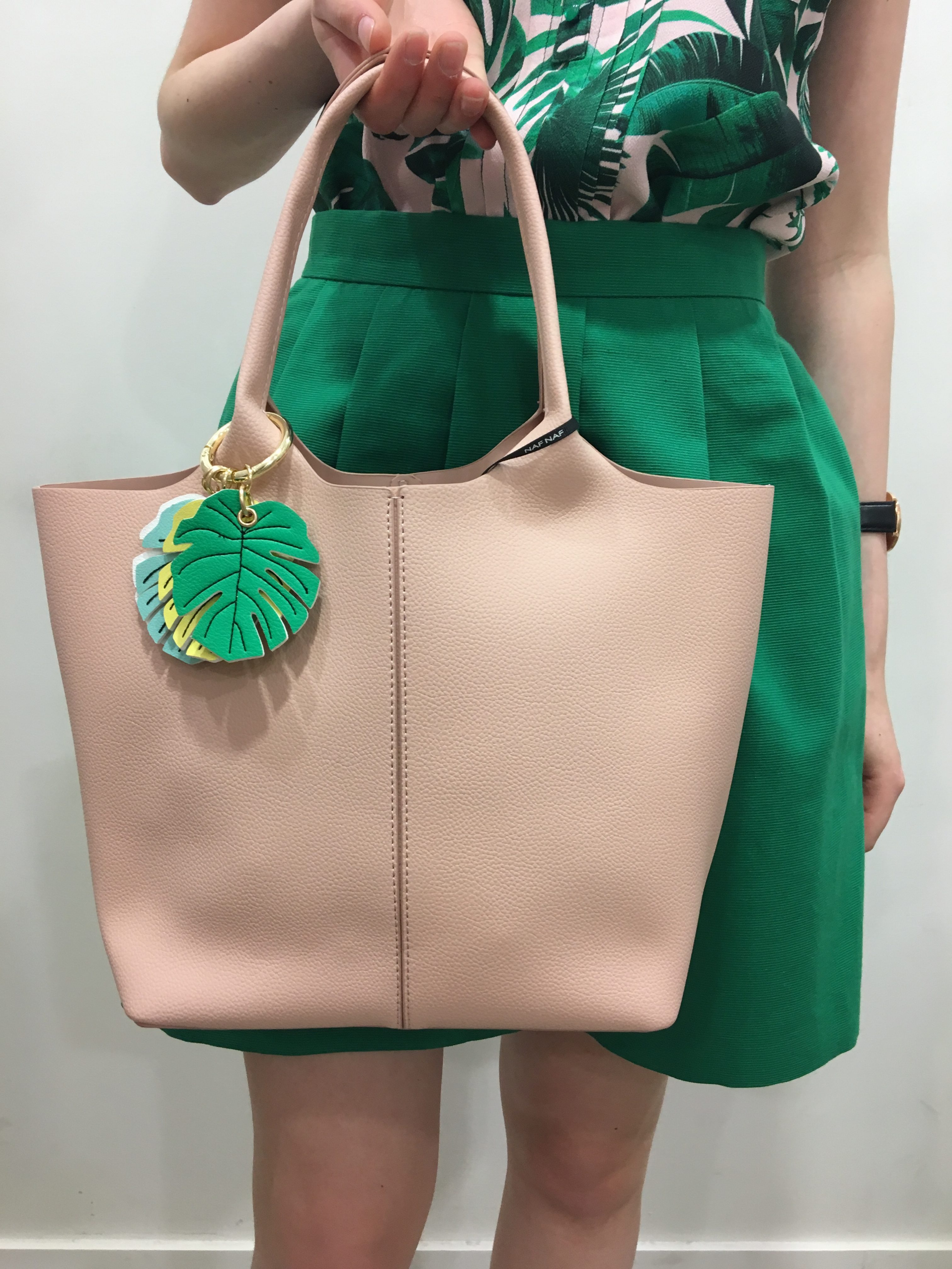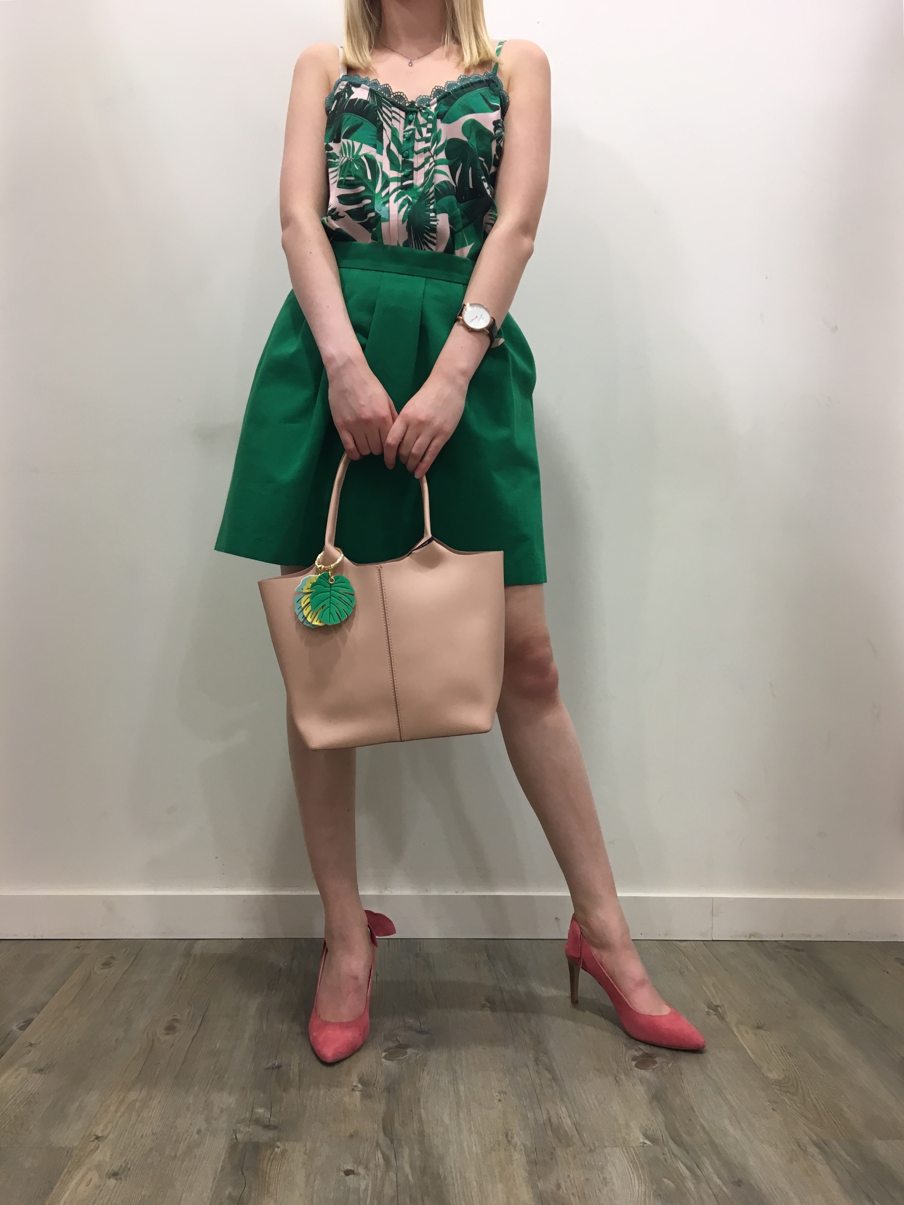 Car la tenue d’une femme ne se dispense jamais d’un sac, j’ai incorporé un cabas large à mon look NAF NAF. Il contient une poche centrale qui vous permettra de mettre un peu d’ordre dans vos affaires. Coloré d’un joli et frais nude rosé, il rappelle la couleur de fond du top. Le cabas est agrémenté d’un petit porte-clefs feuillu. Un apport de fraicheur qui siéra parfaitement à une petite virée citadine.