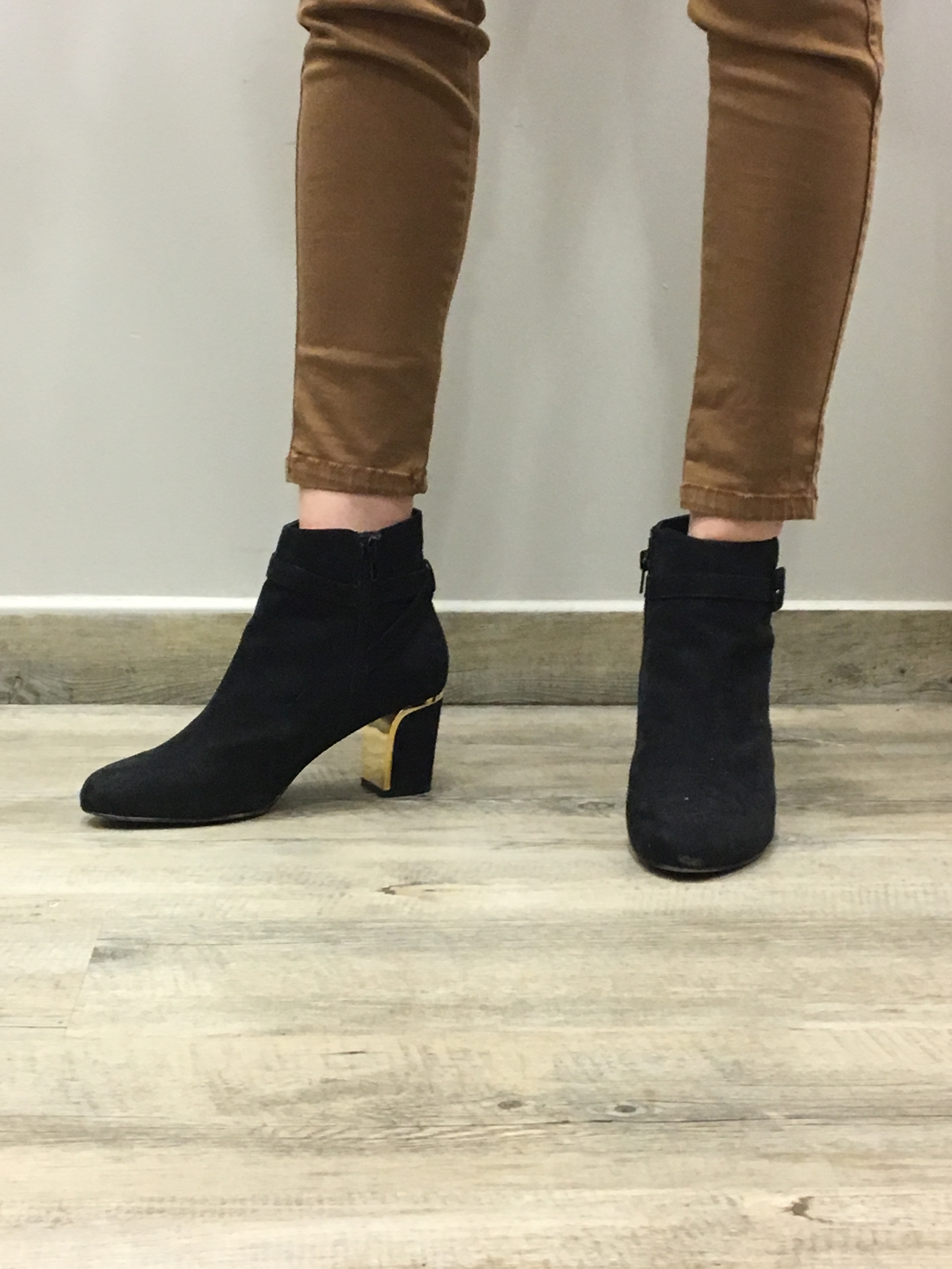 Je vous épargne les détails de mes péripéties pour les retrouver, mais ça y est je les ai ! Cette paire de bottines noires NAF NAF est à moi. Elles sont en textile au dessus et en cuir à l’intérieur. C’est son talon doré de 6 cm qui m’a fait craquer. Je les trouve vraiment chic !