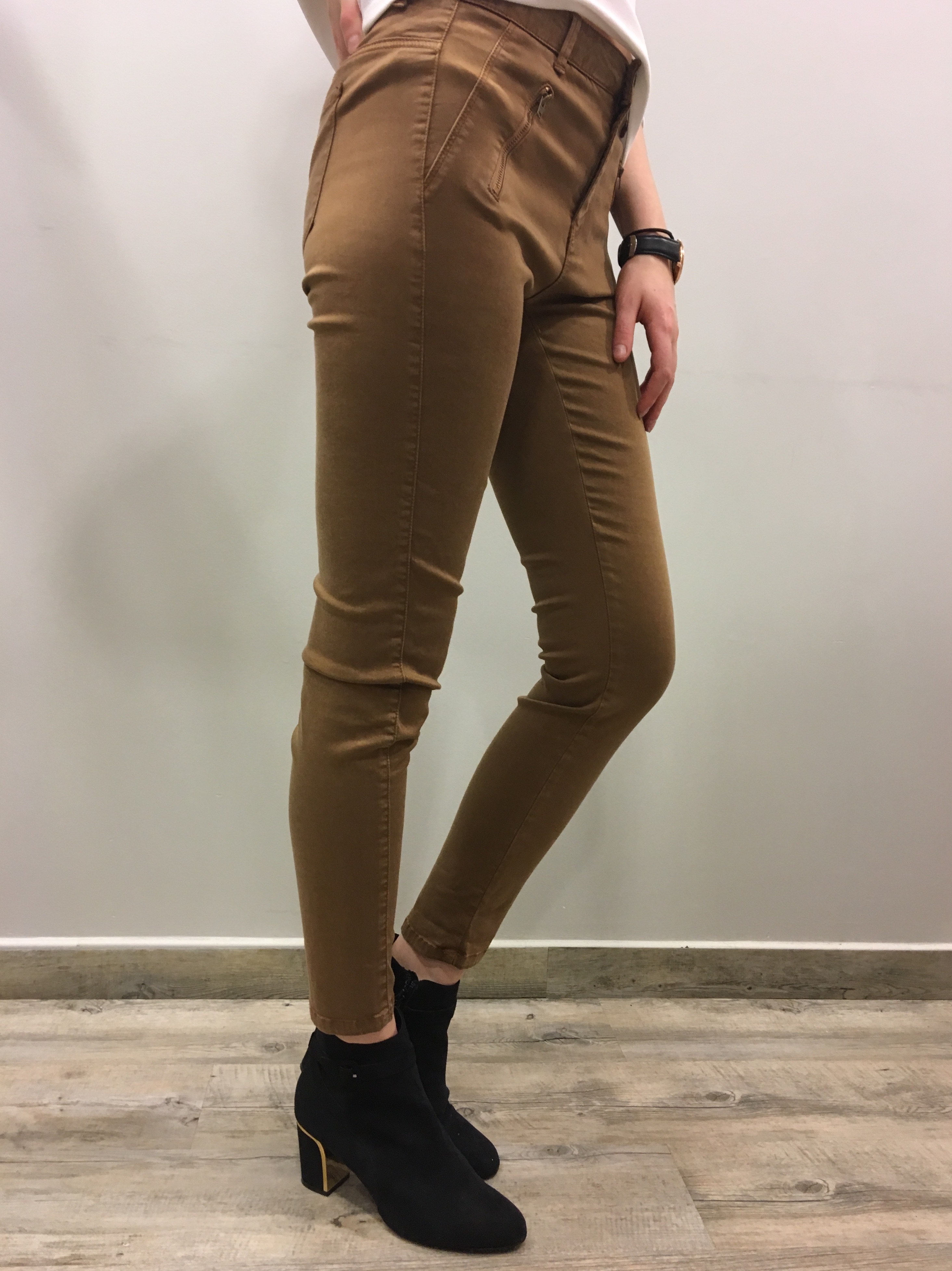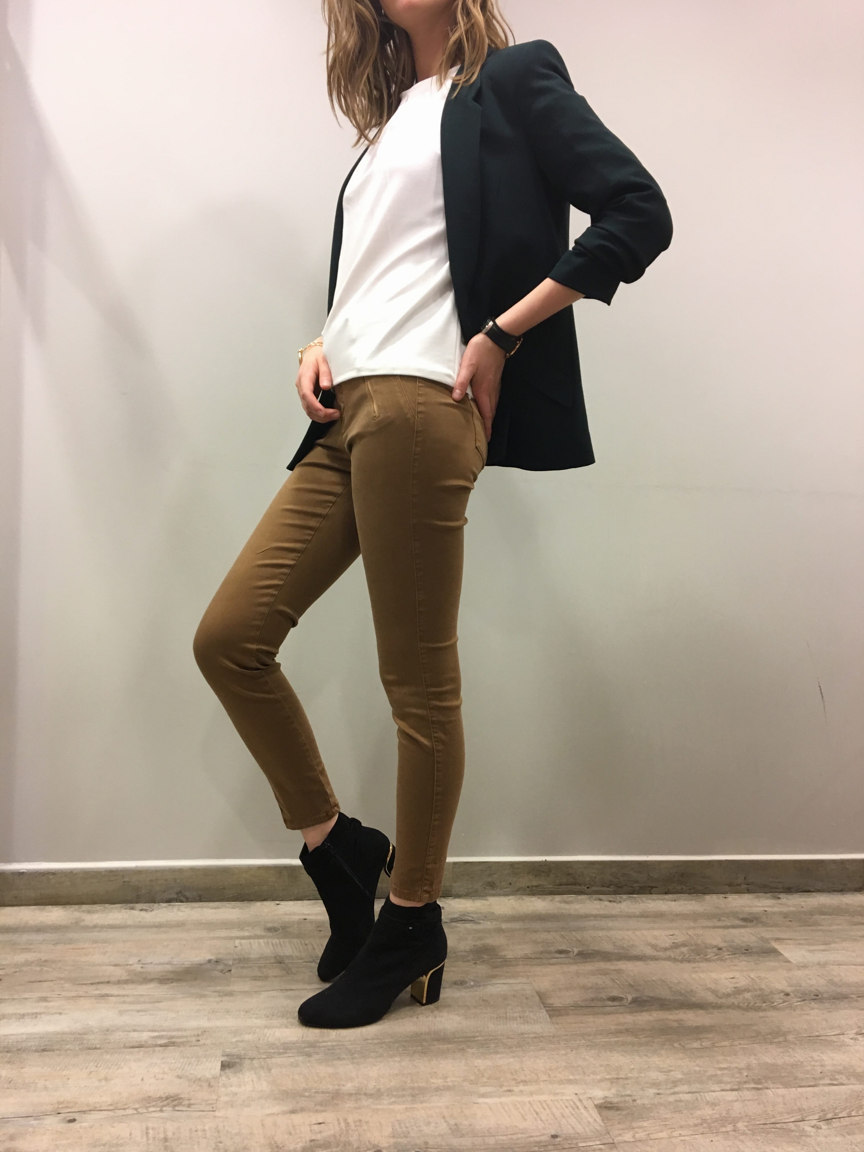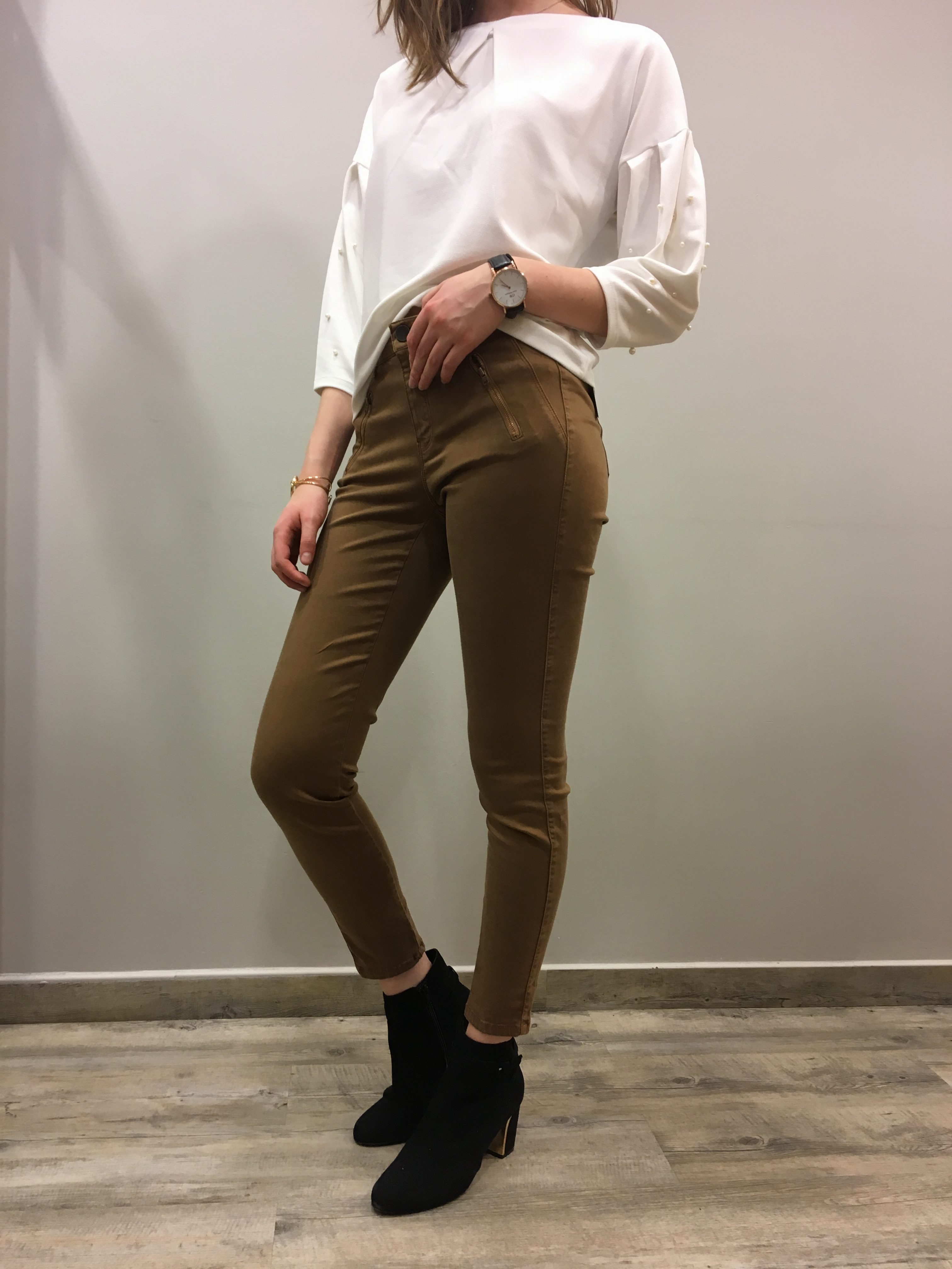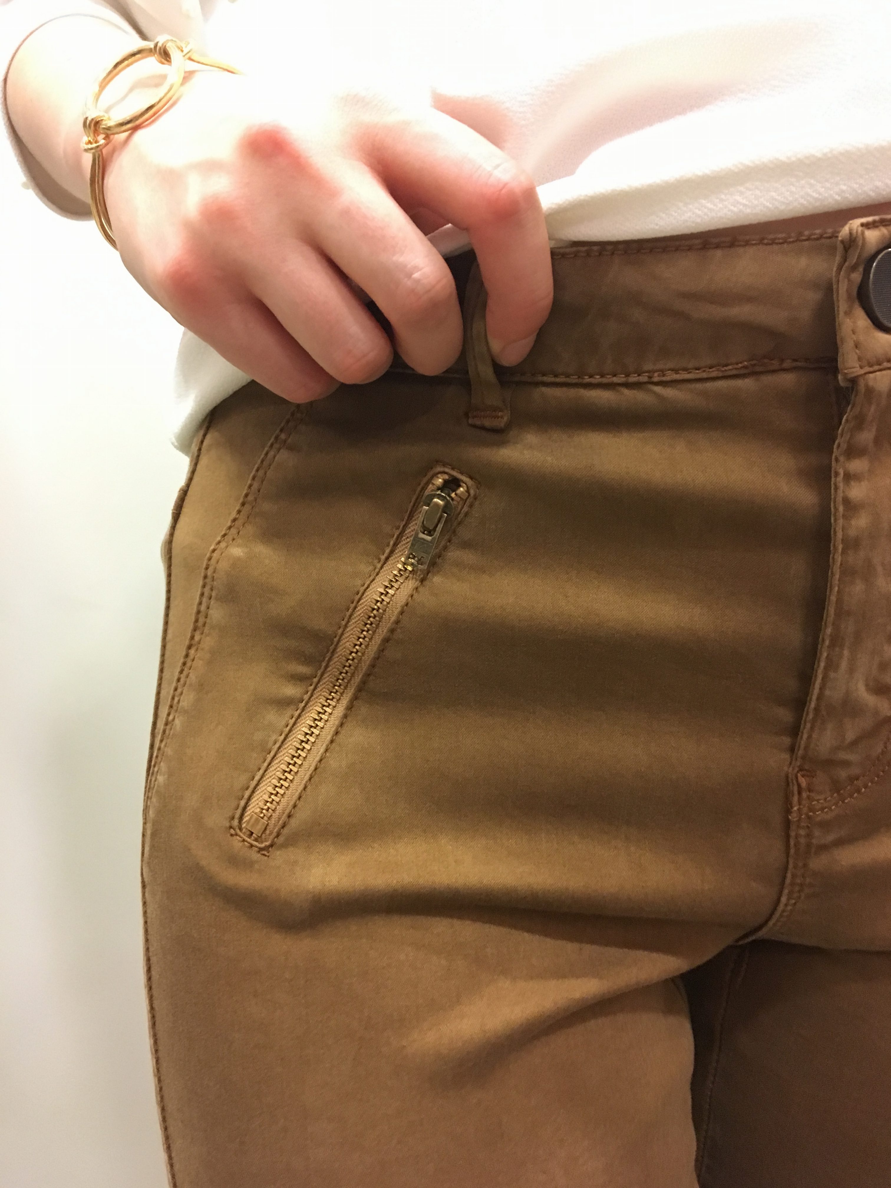 Vous reconnaissez ce pantalon ? C’est le même que le kaki présentait sur l’article de ma veste en jean brodée. Cette fois, c’est en marron clair qu’on le retrouve. J’aime toujours autant le détail des fermetures sur le devant du pantalon.