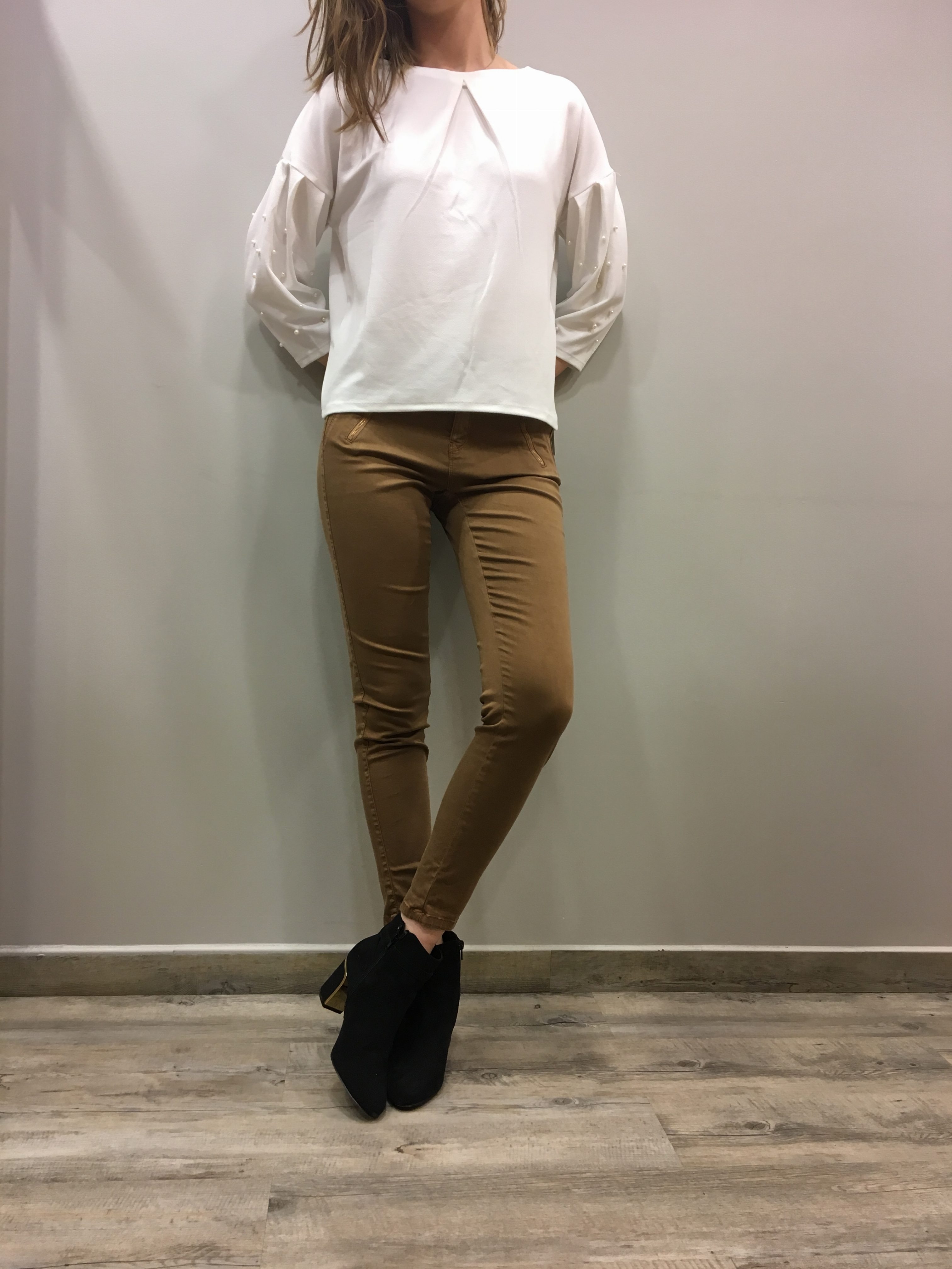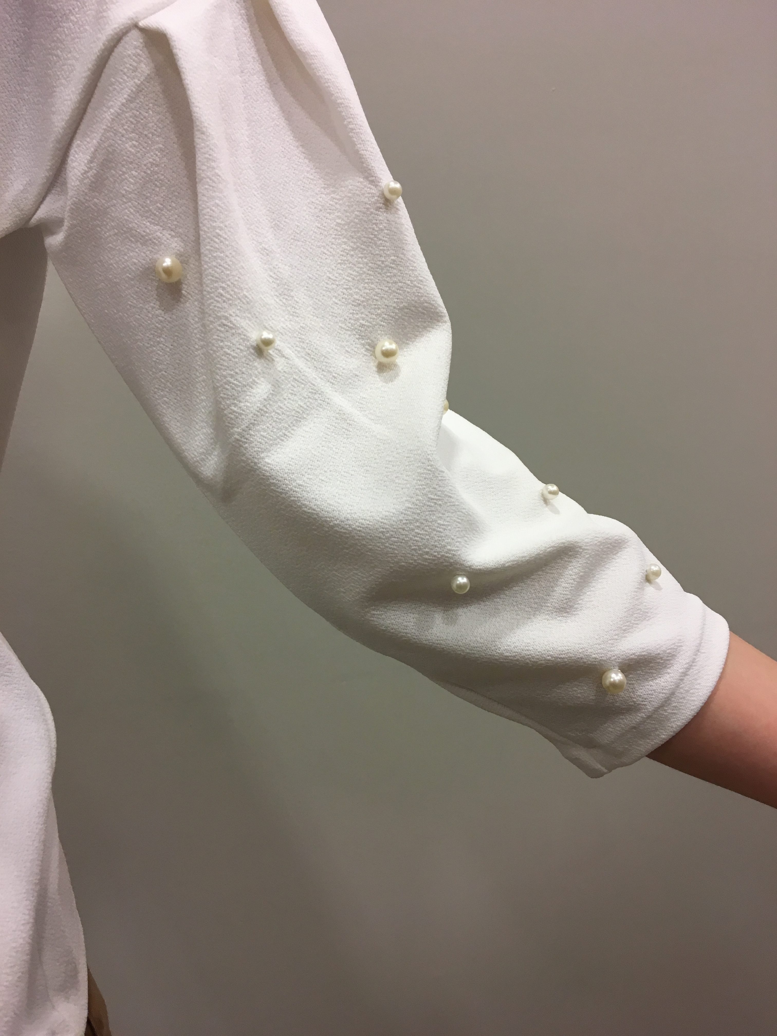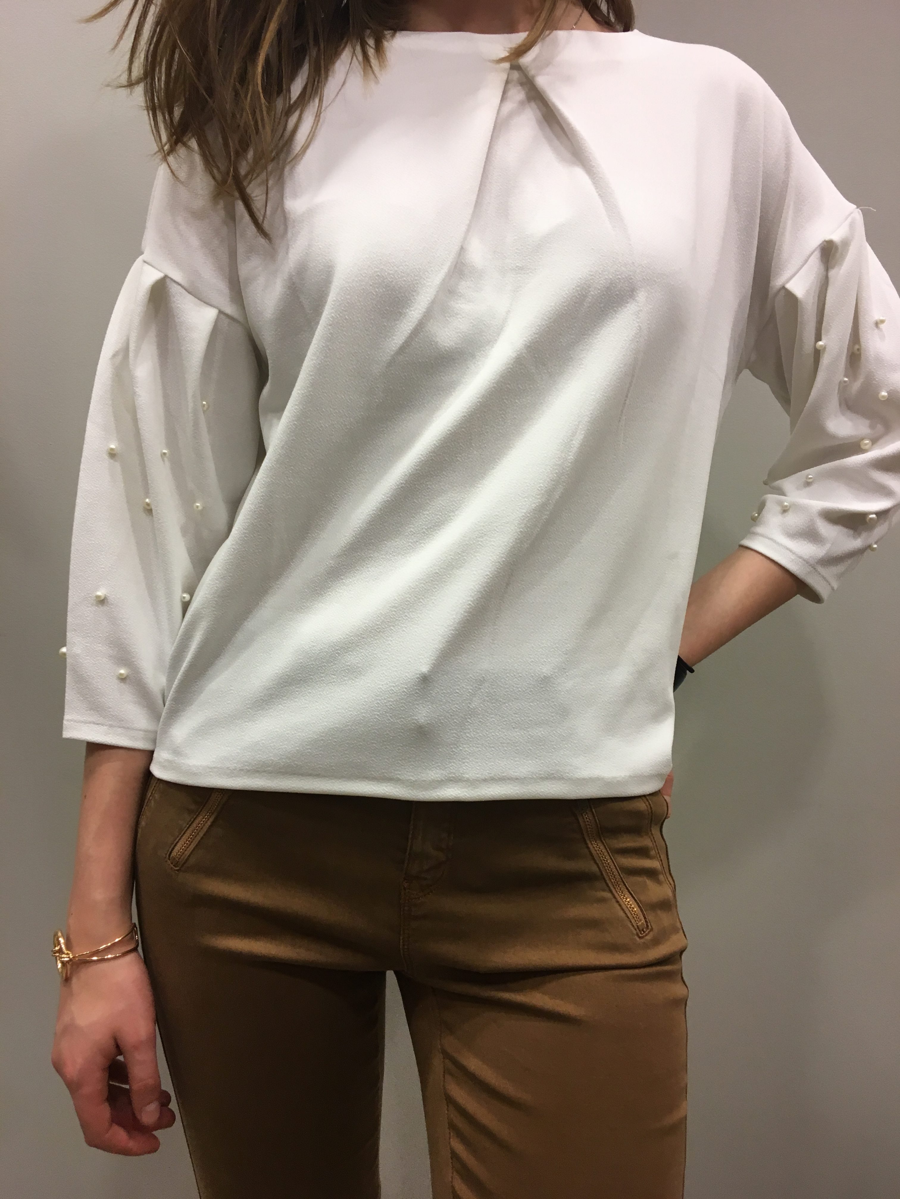 Après le sweat, c’est le top aux manches bouffantes. Et quand les perles ne sont pas sur les épaules, elles sont sur les manches. La couture en haut au centre du top sépare le tissu en un pli qui retombe sur la poitrine. J’ai craqué autant pour l’esthétisme de ce top que pour son confort. La matière est très agréable.