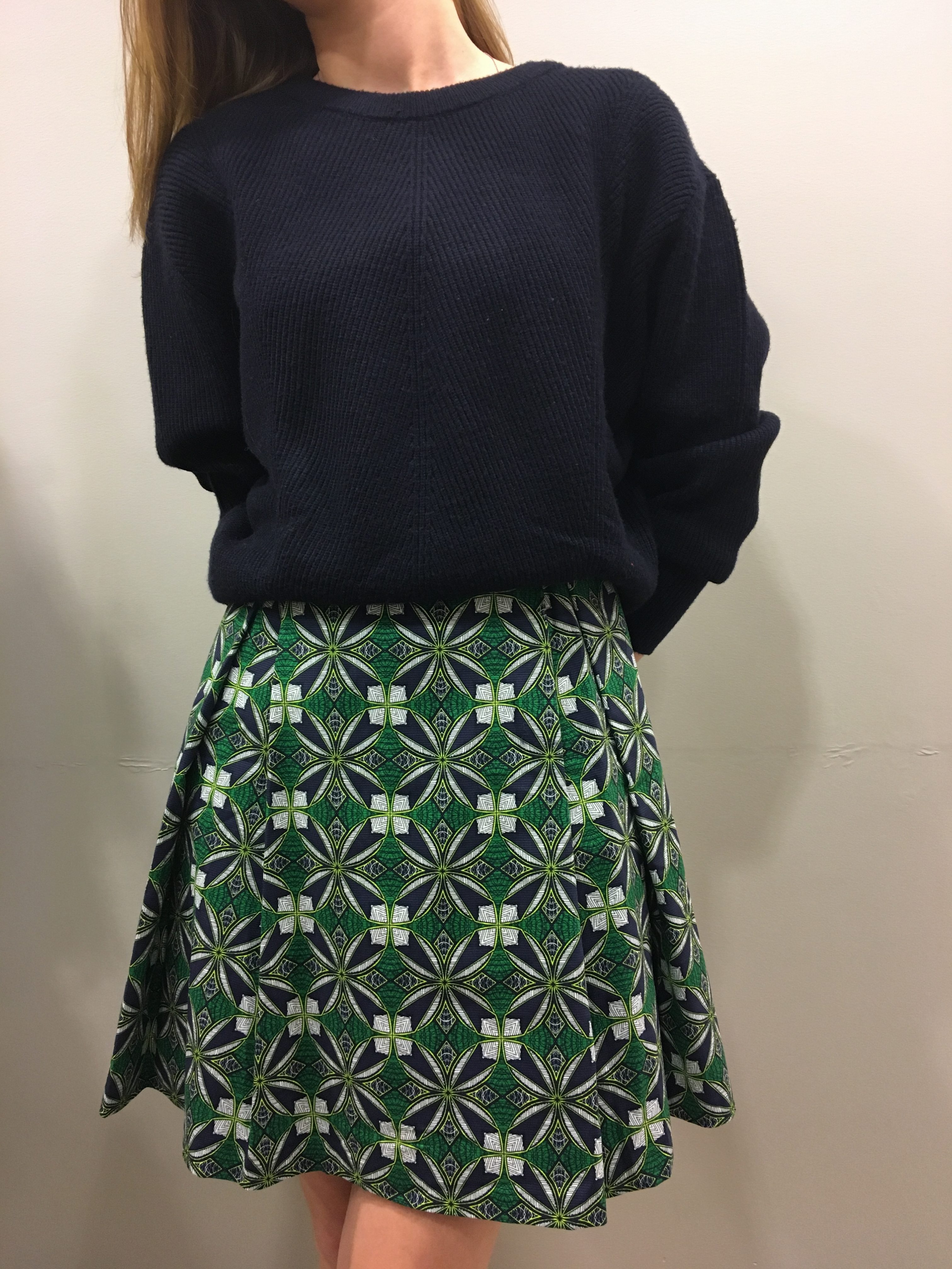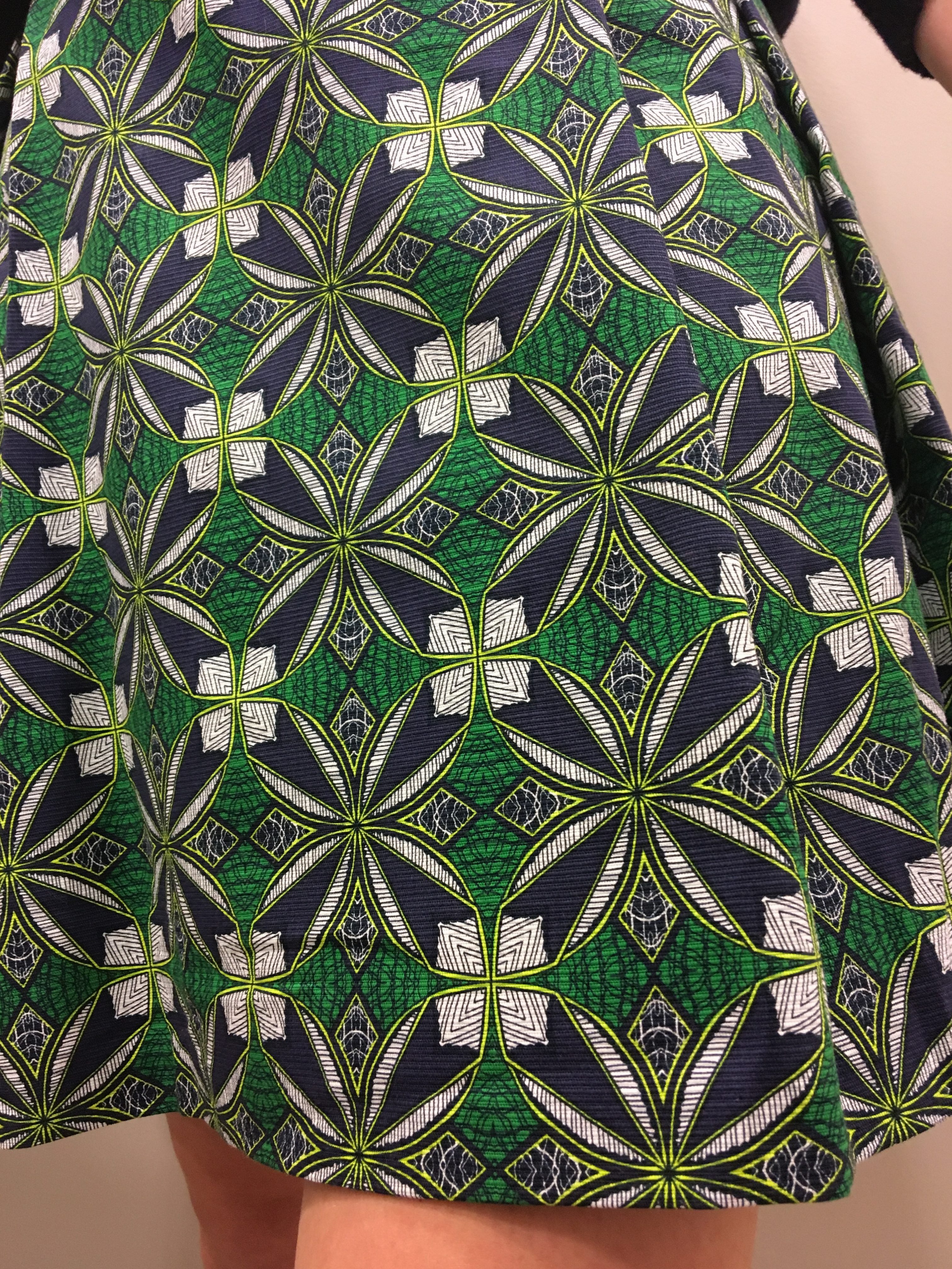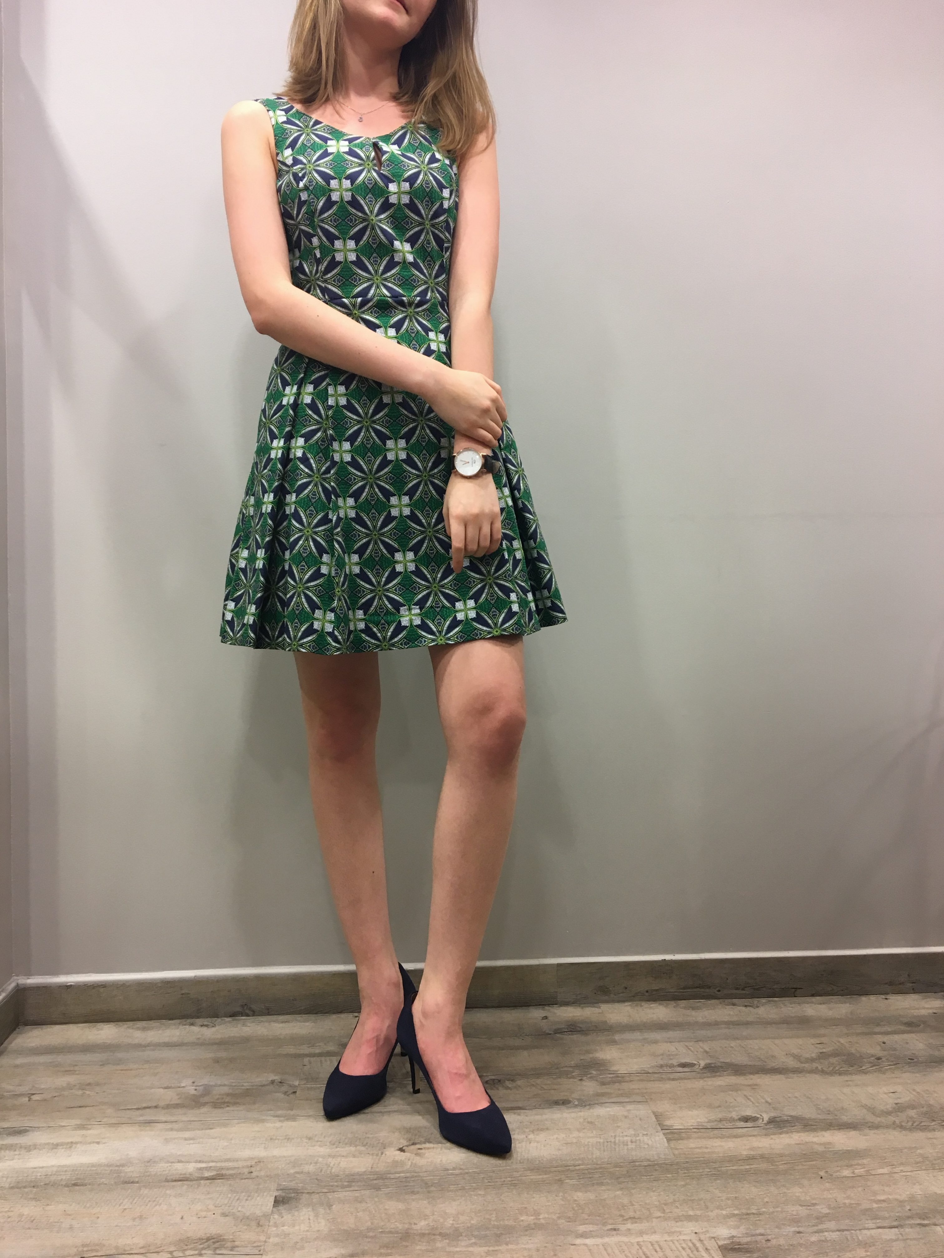 J’ai longuement hésité entre la jupe et la robe. J’étais conquise par les deux mais pour deux choses différentes. La jupe pour l’automne-hiver et la robe pour le printemps-été. C’est finalement la robe en jacquard imitation wax qui l’a emporté. Elle est cintrée à la taille et part légèrement en évasé. Je trouve que sa coupe est très élégante, très féminine. Les couleurs sont super interessantes : bleu marine, jaune, blanc et vert !